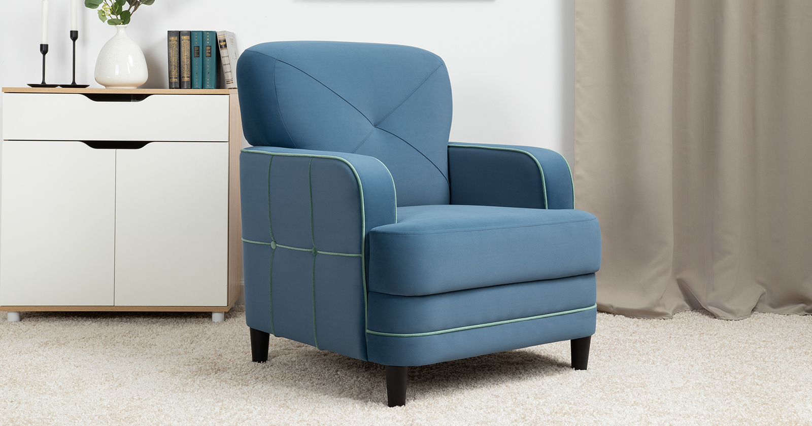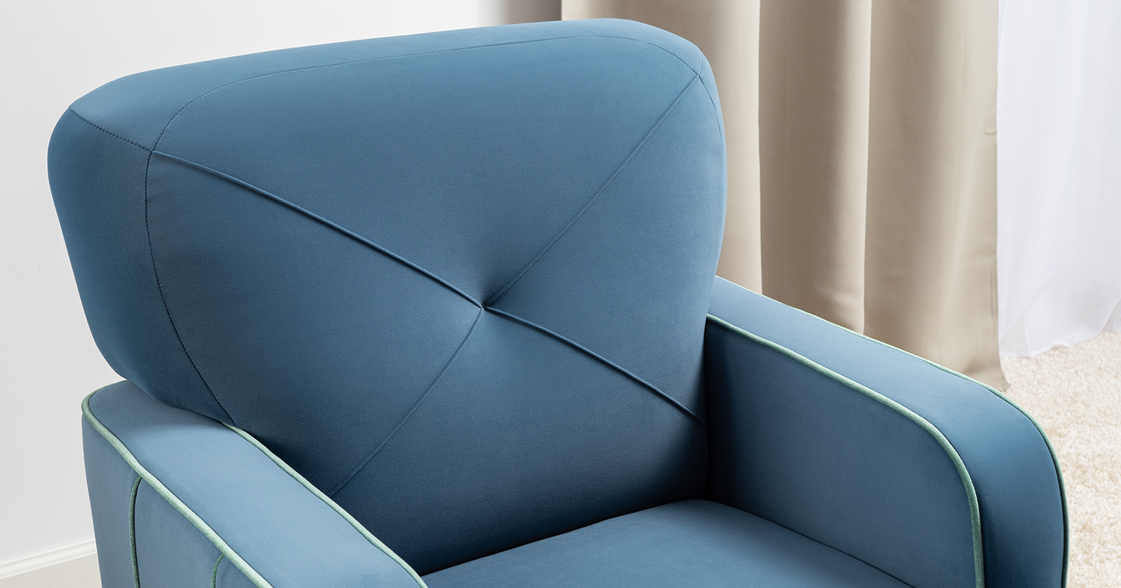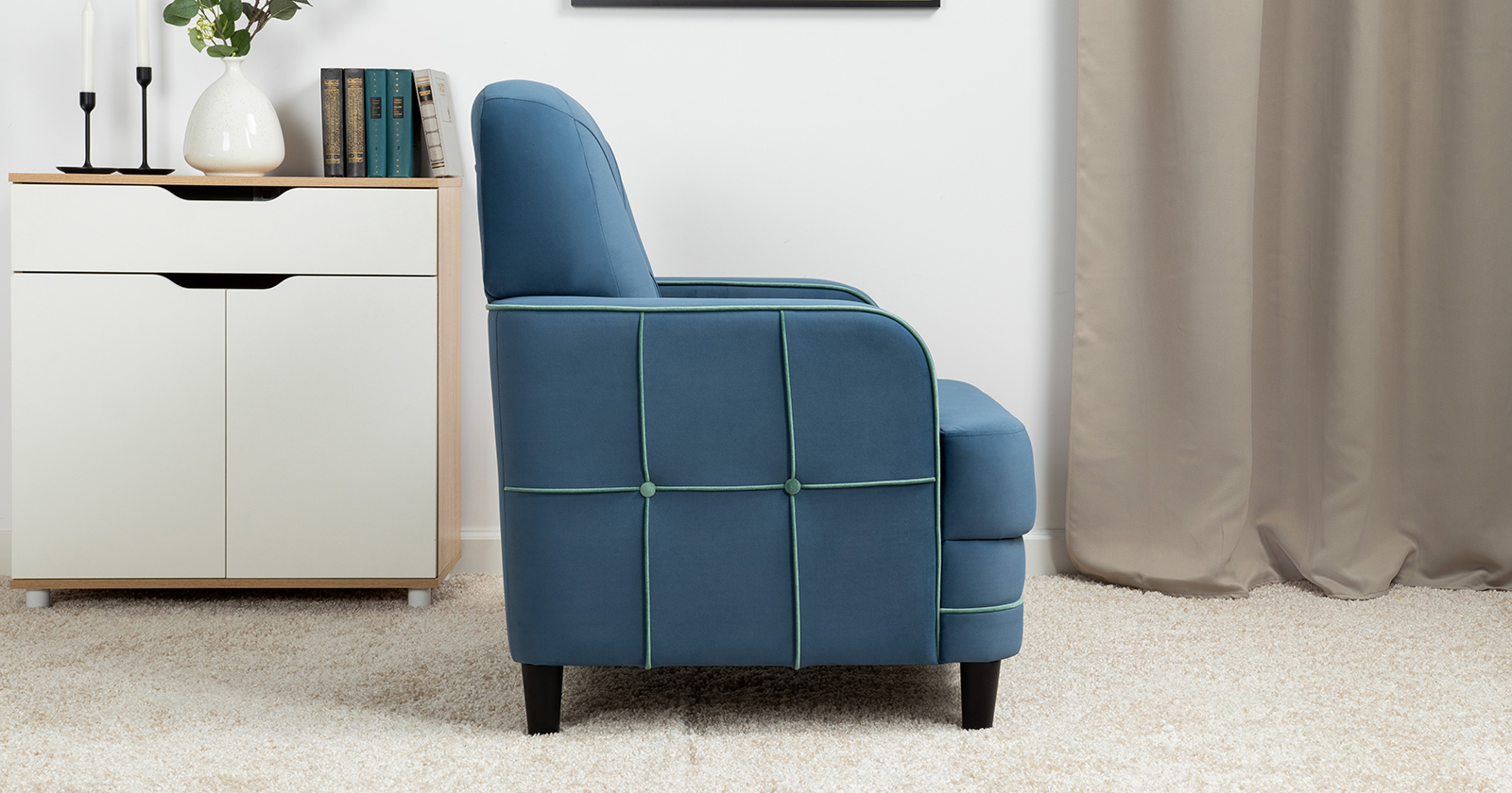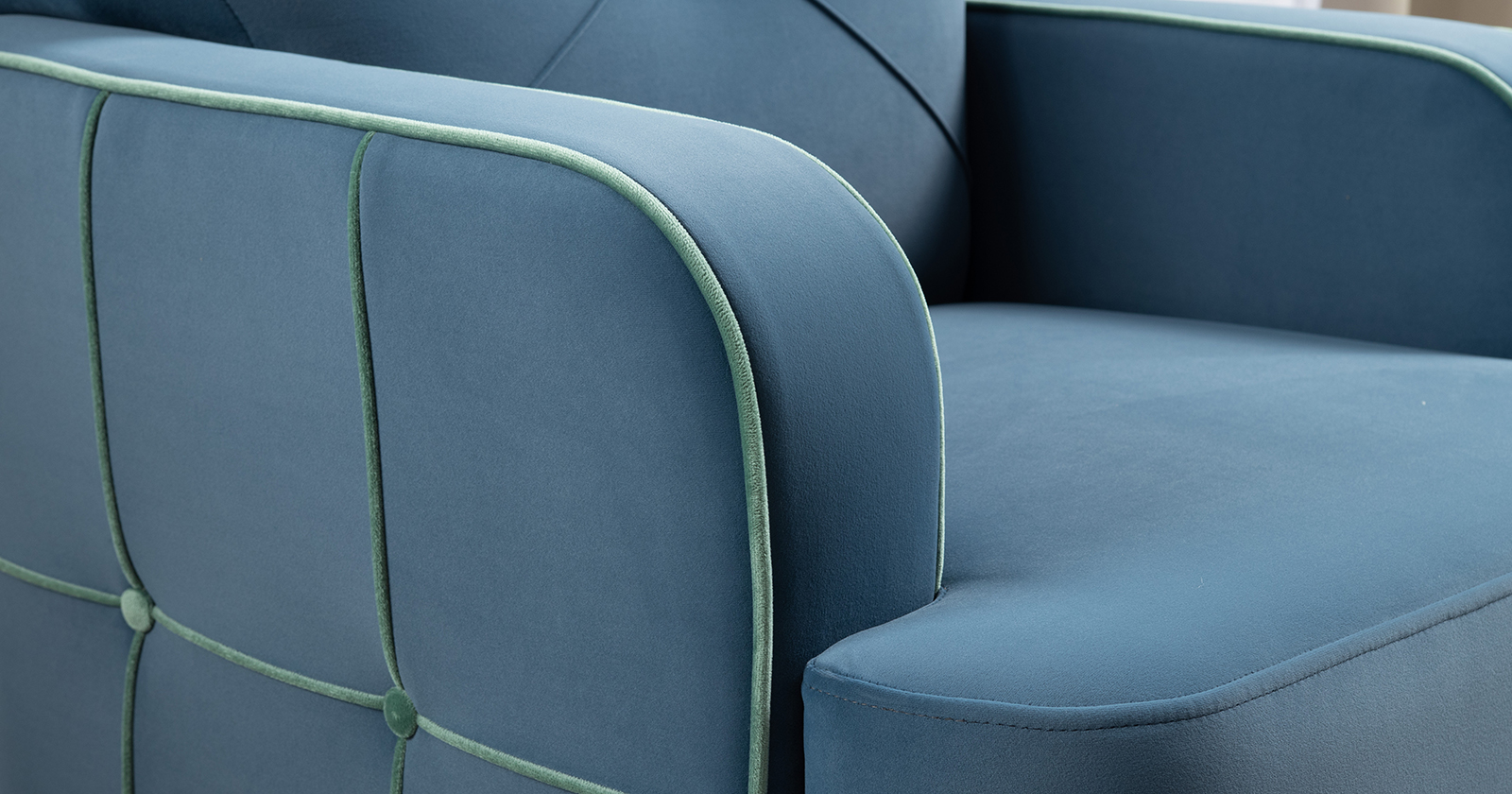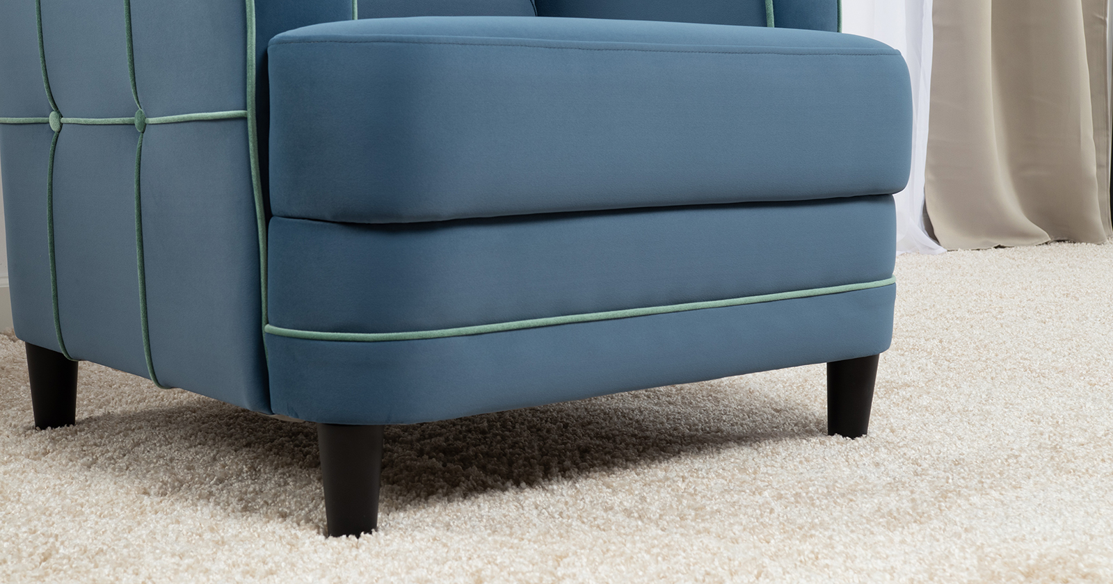 Декоративные канты на подушках и вставке подлокотников. Пуговицы в местах пересечения кантов на подушке и вставке подлокотников. По торцам подлокотников и думках контрастный декоративный кант. Защипы на сиденье и средней большой подушке.