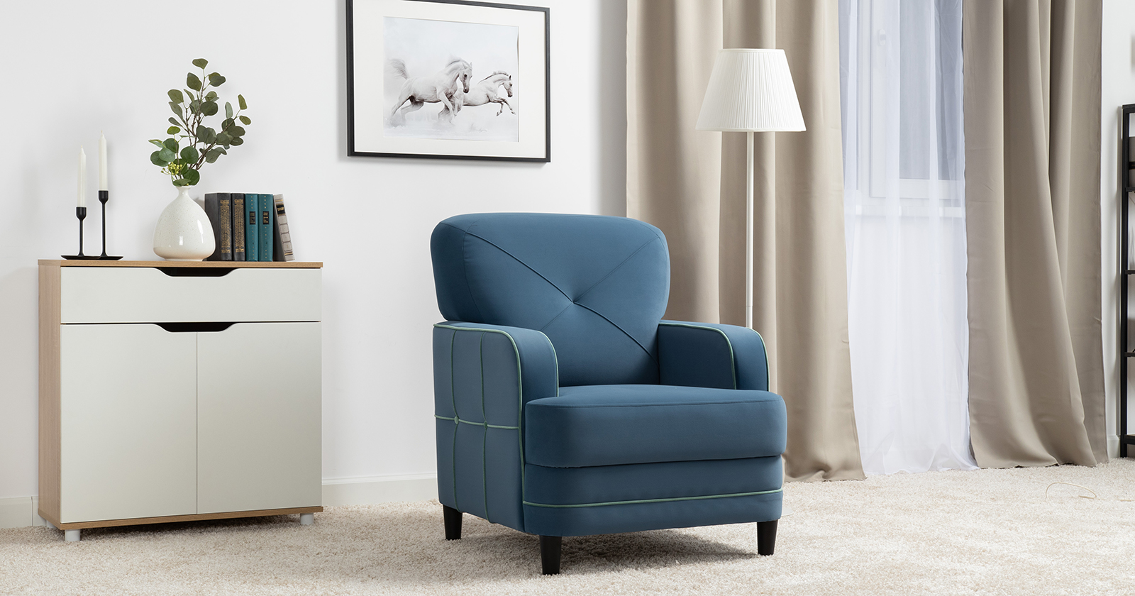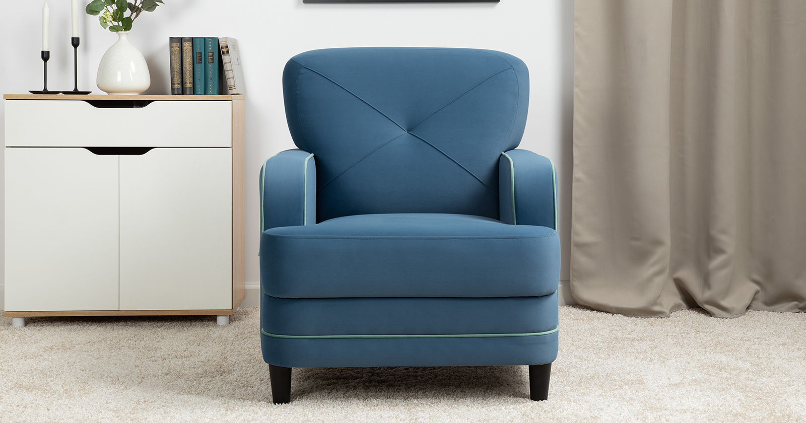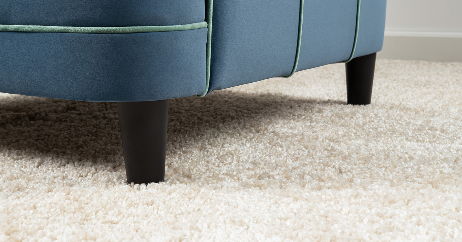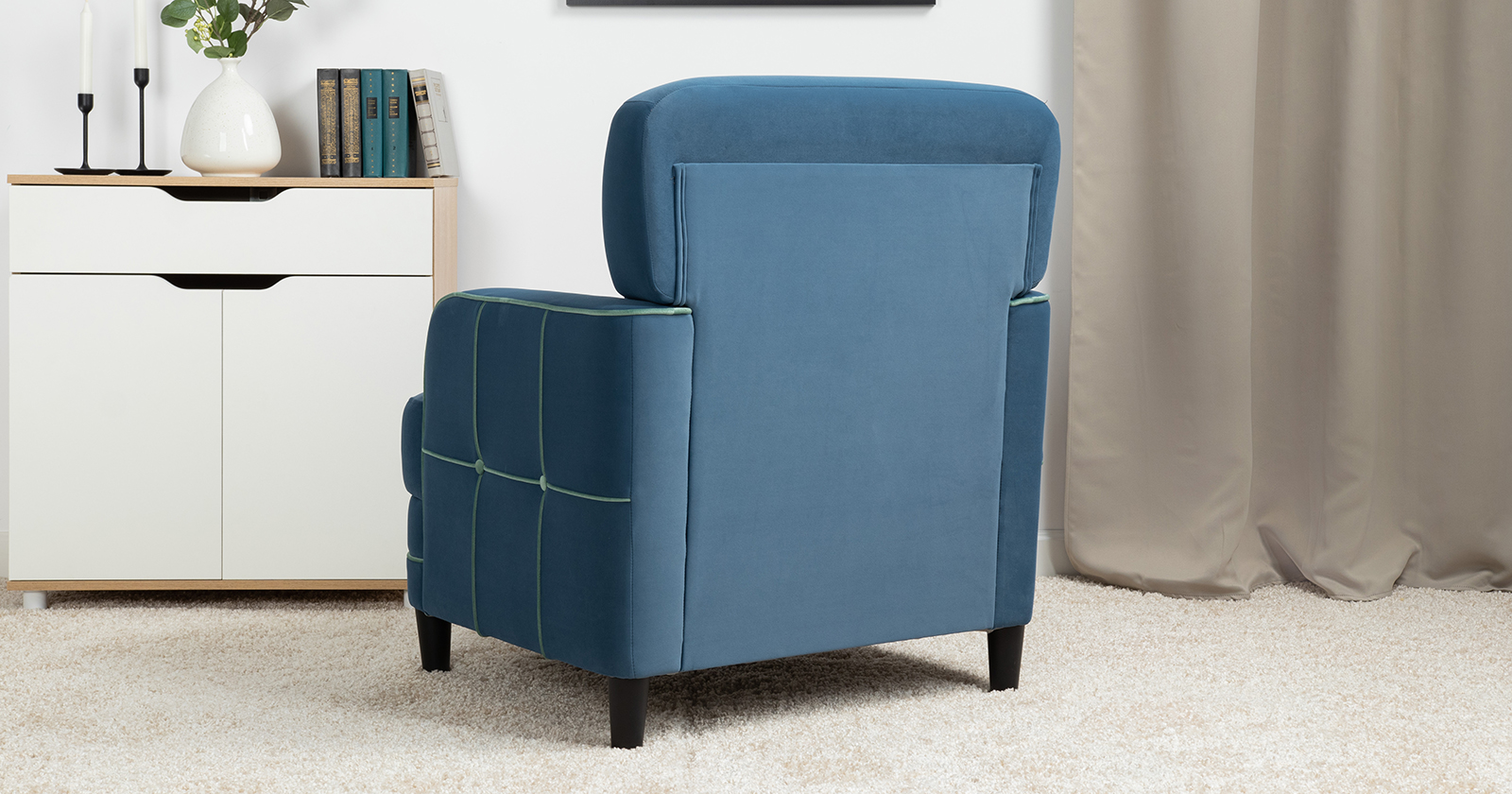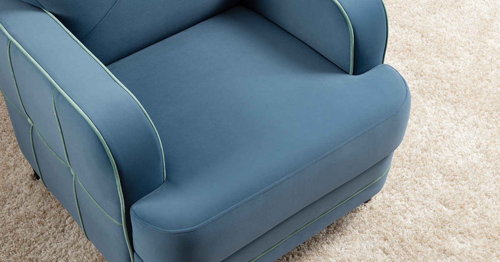 Декоративные канты на подушках и вставке подлокотников. Пуговицы в местах пересечения кантов на подушке и вставке подлокотников. По торцам подлокотников и думках контрастный декоративный кант. Защипы на сиденье и средней большой подушке.