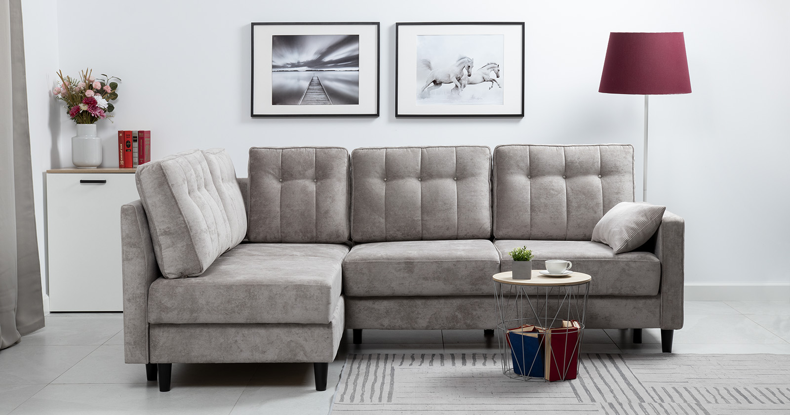 Диван-кровать угловой Арно ТД 567 велюр Лаки 17 пепел розы, Vertical 910 молочно-серый, сборка на любую сторону