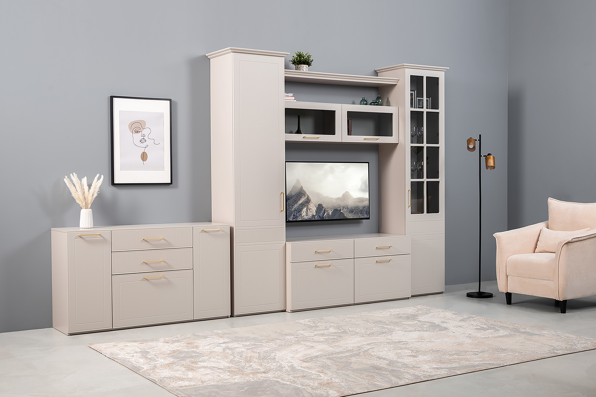 Гостиная Ричфорд композиция 2 с карнизами, кашемир 5981 BS, моно керамика D166-2 ПВХ, белый PE шагрень (собирается на любую сторону)