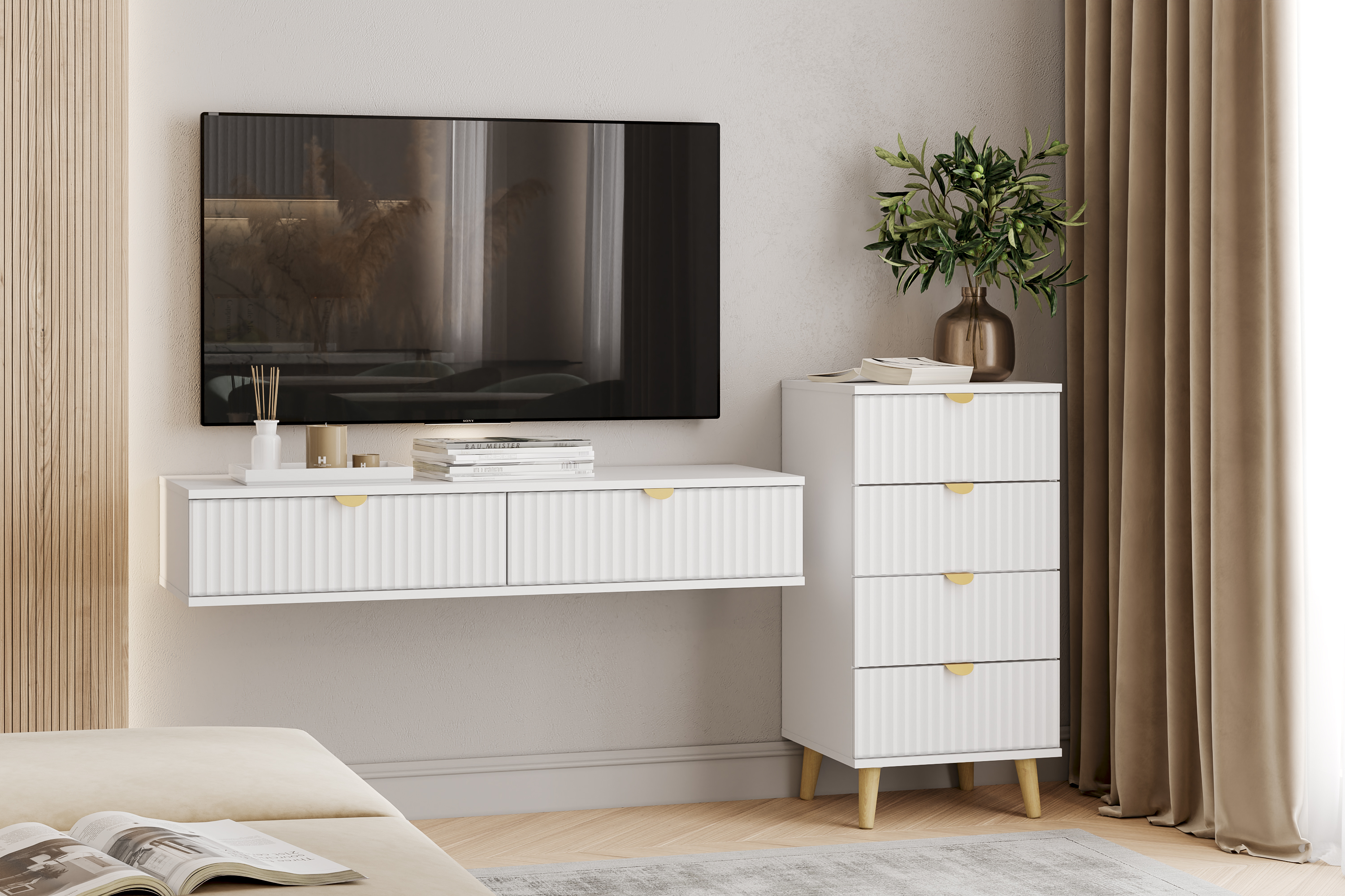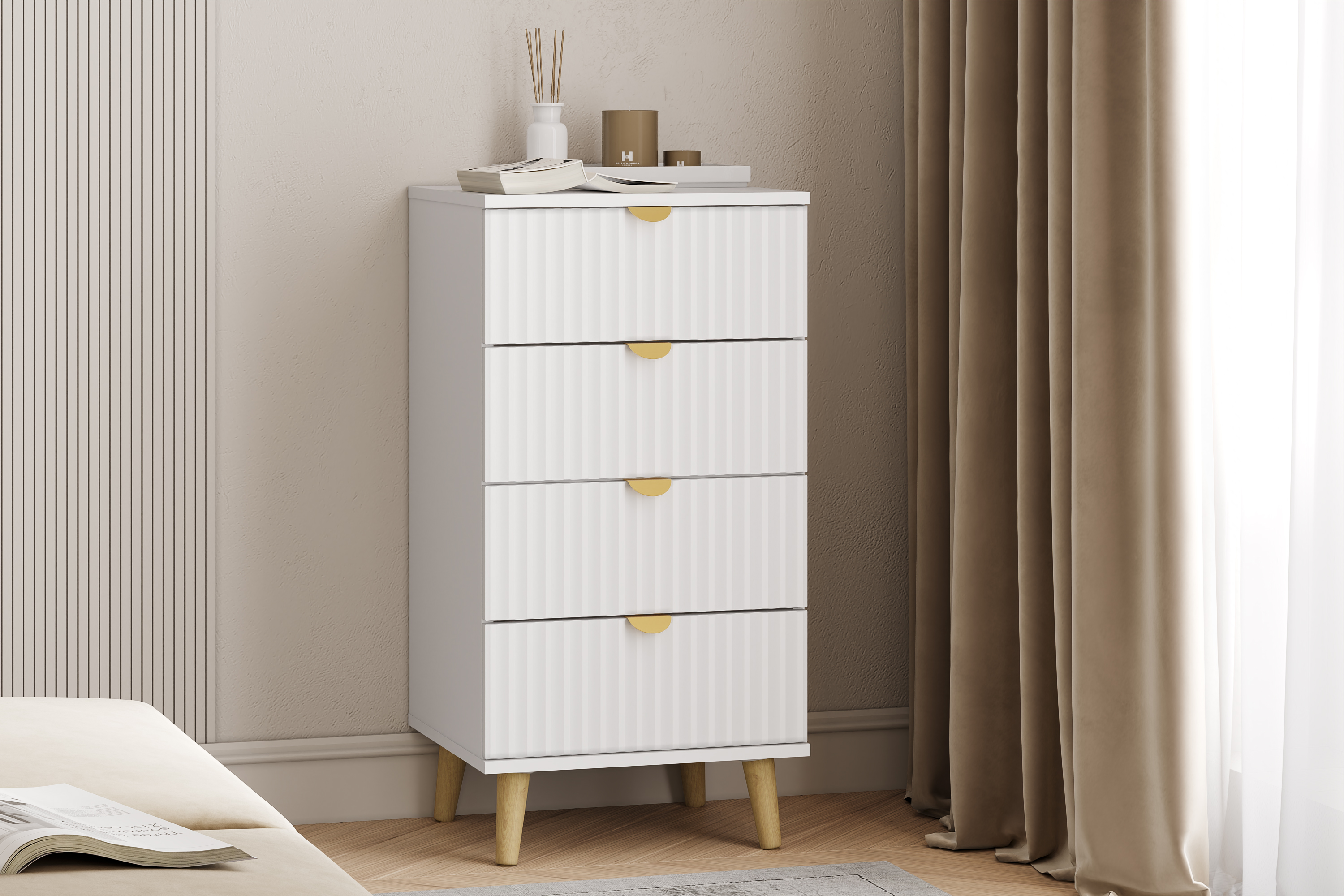Комод оснащен четырьмя выдвижными ящиками, которые открываются плавно и бесшумно благодаря шариковым направляющим, а высокие опоры облегчают процесс уборки.