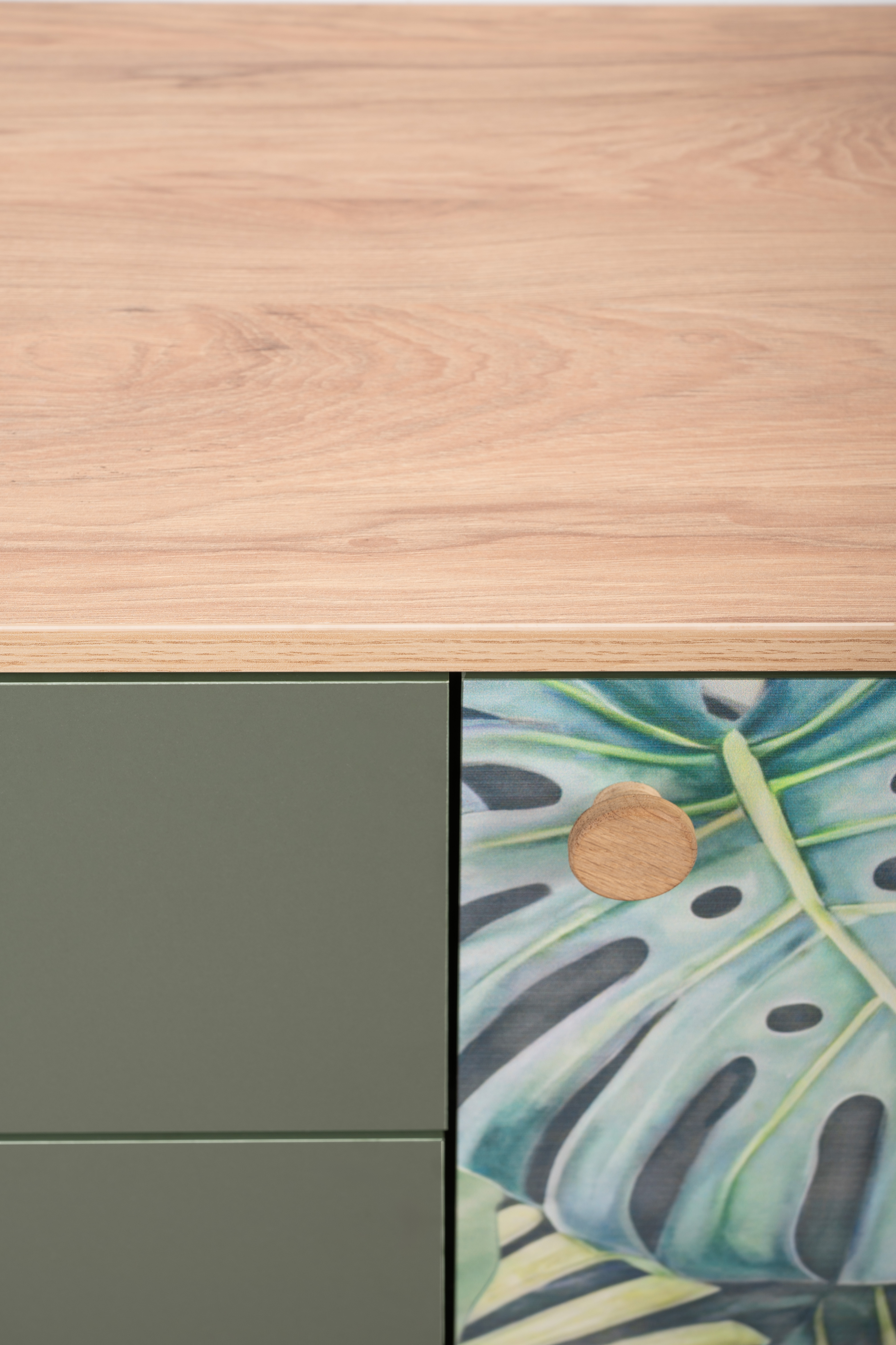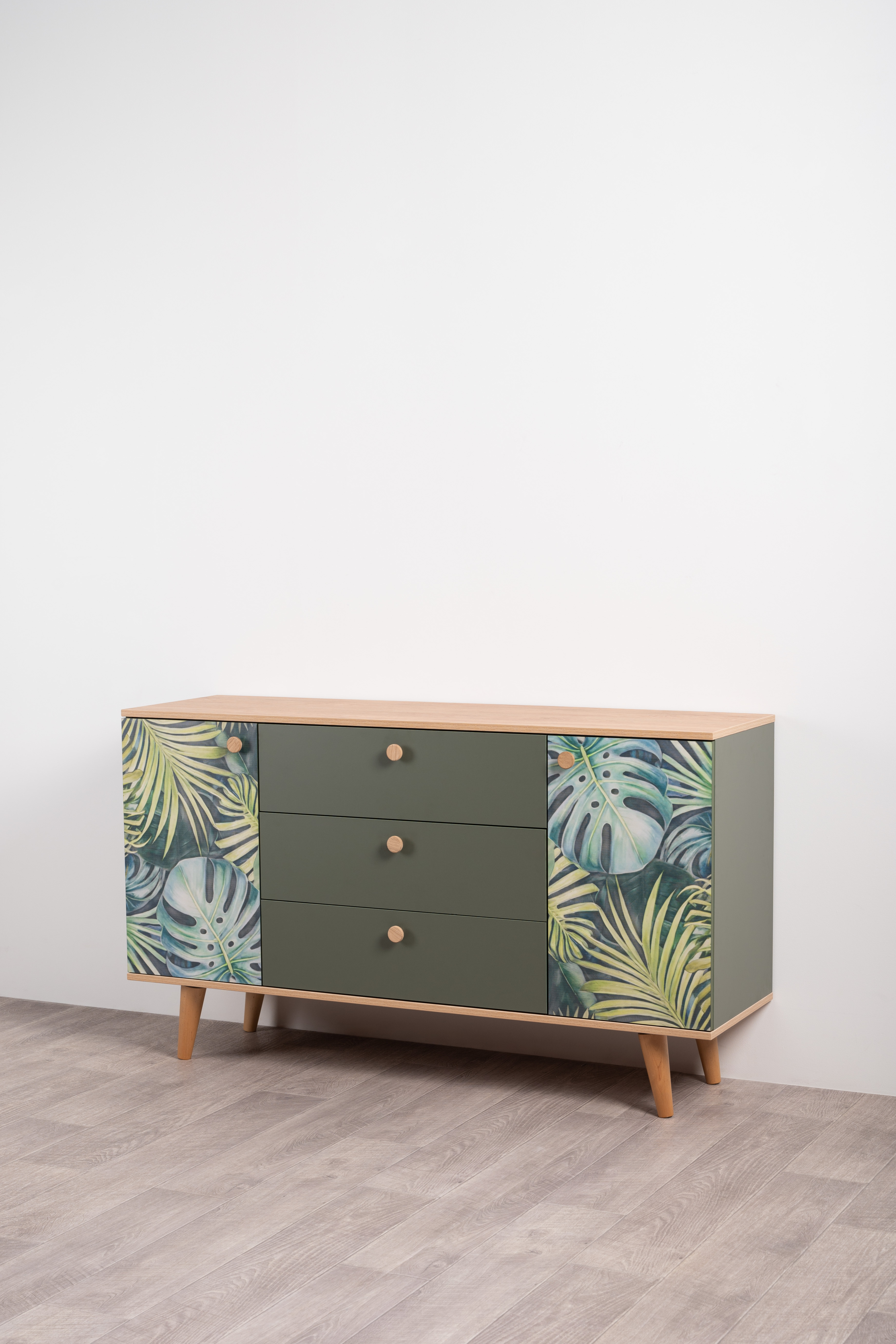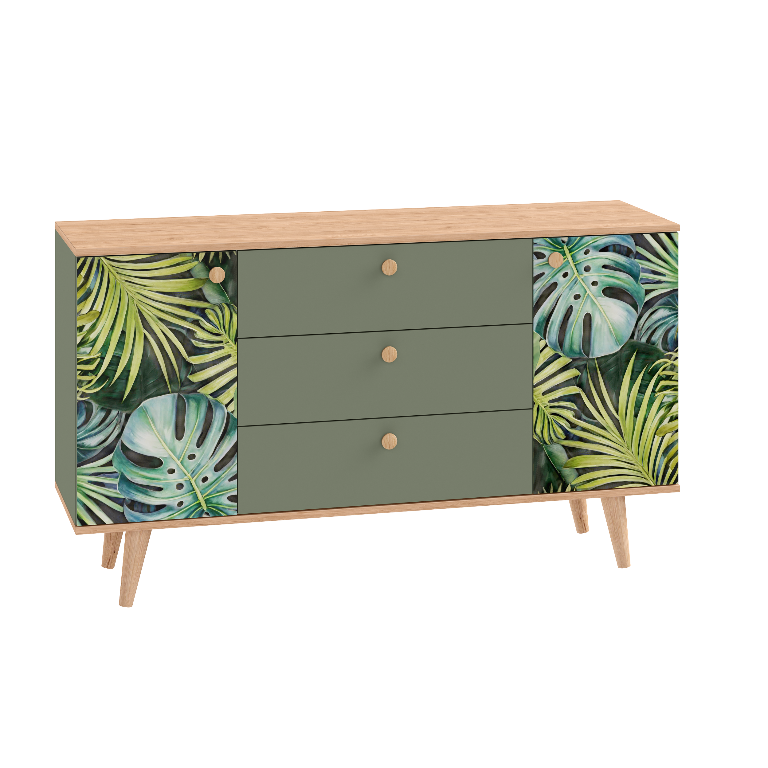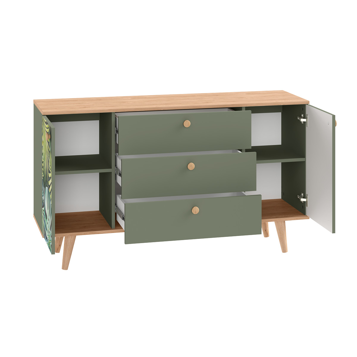 Комод Маттиас 16.245 дымчатый зеленый K521, гикори рокфорд натуральный KO86 PW, белый PE шагрень, фотопечать