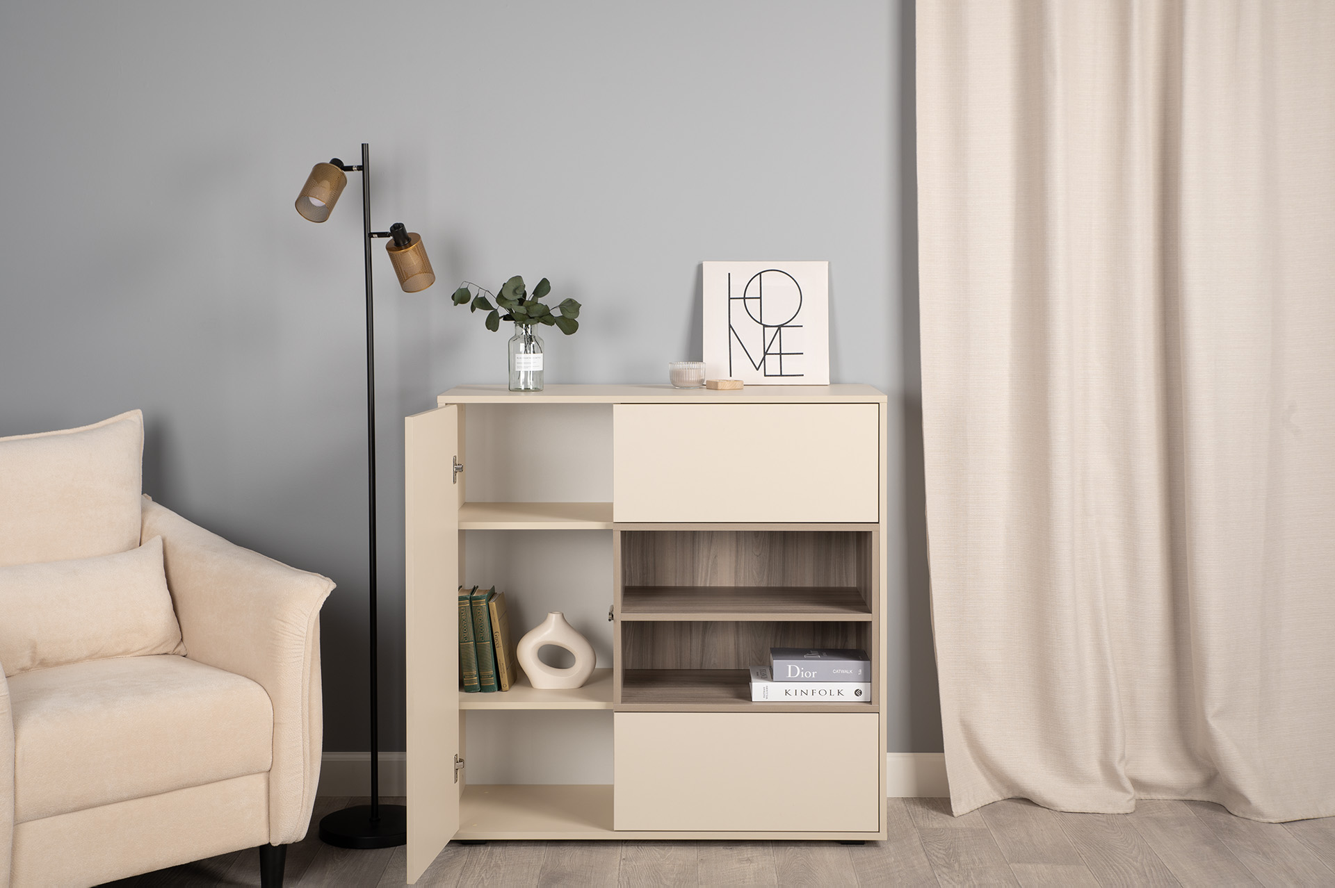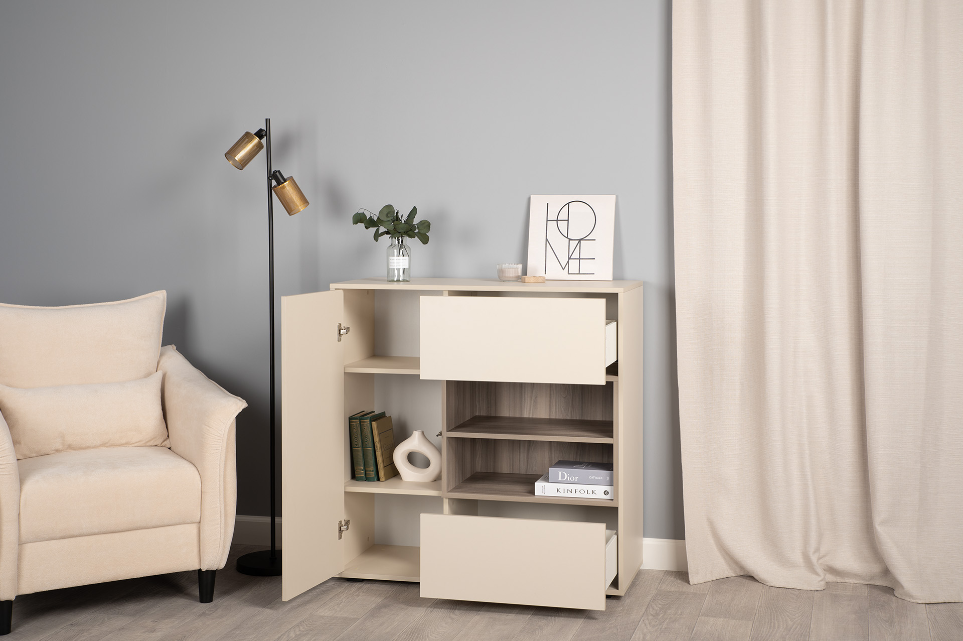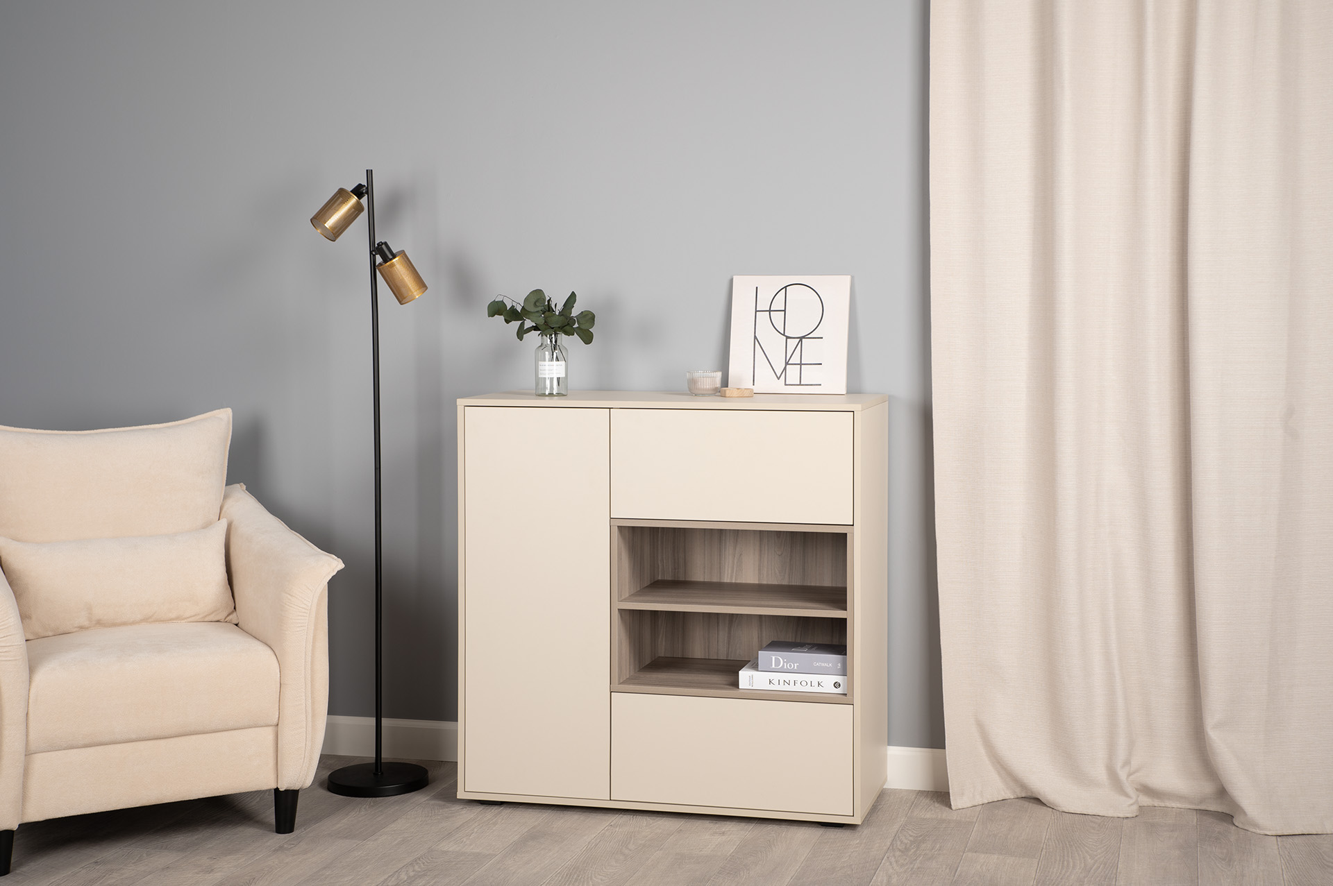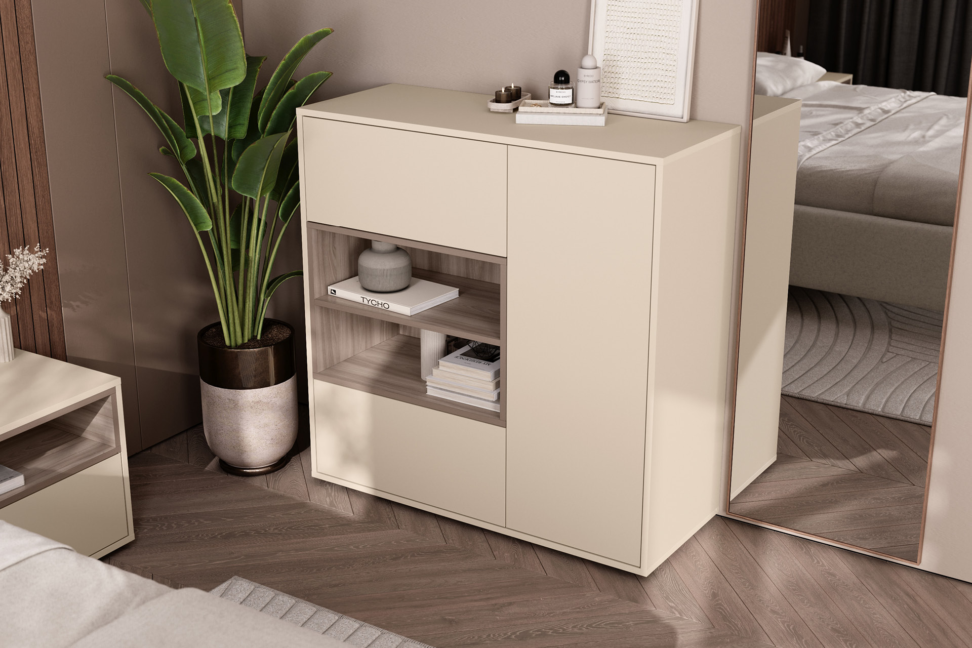 Комод Тайл 16.237 сатин 7045 SU, эмили блаш U9135, белый PE шагрень, собирается на любую сторону