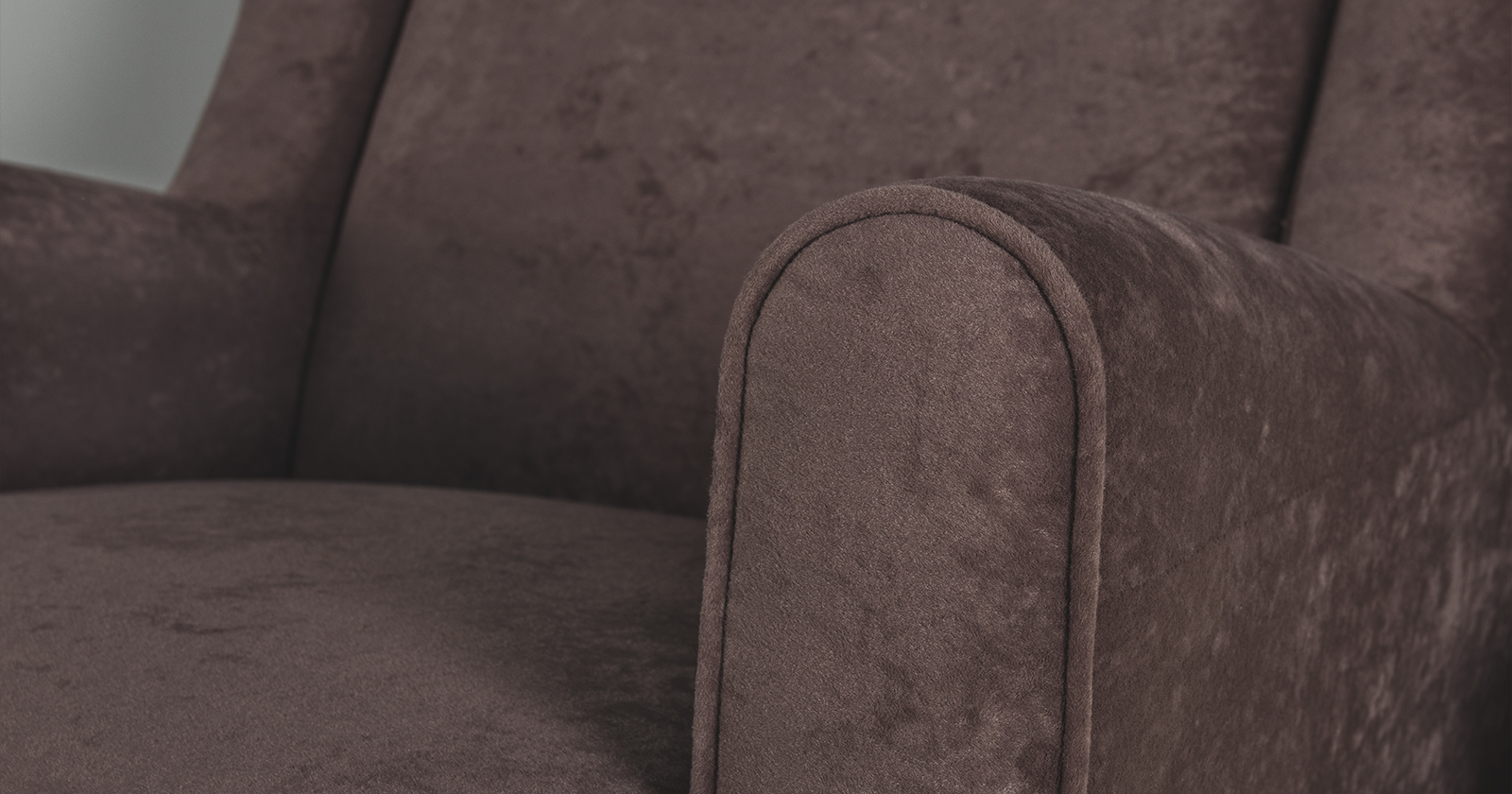 Декоративный кант из основной ткани по переднему торцу подлокотника; Утяжка спинки на 2 декоративные пуговицы из основного материала; Декоративный элемент царги из материала-компаньона.