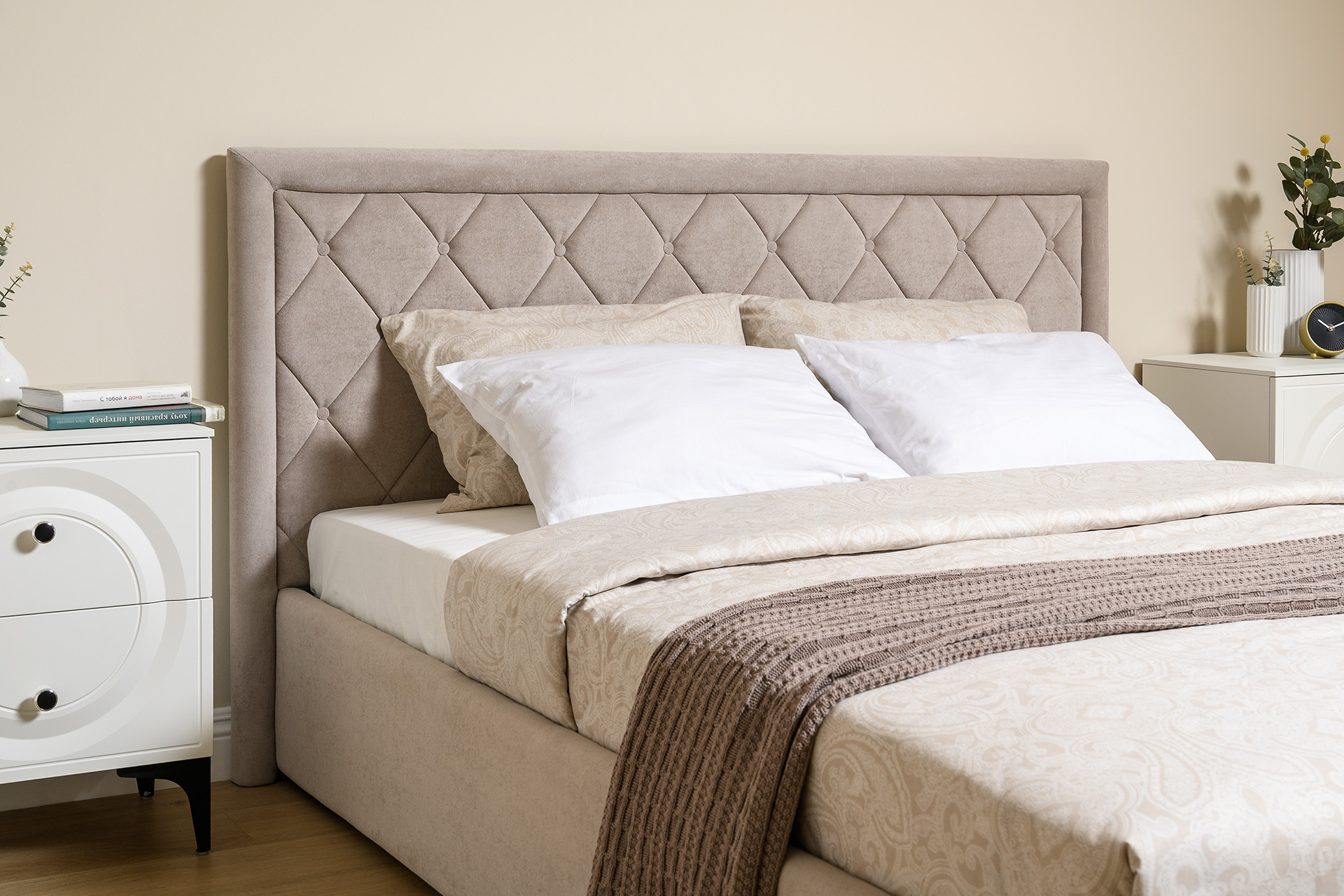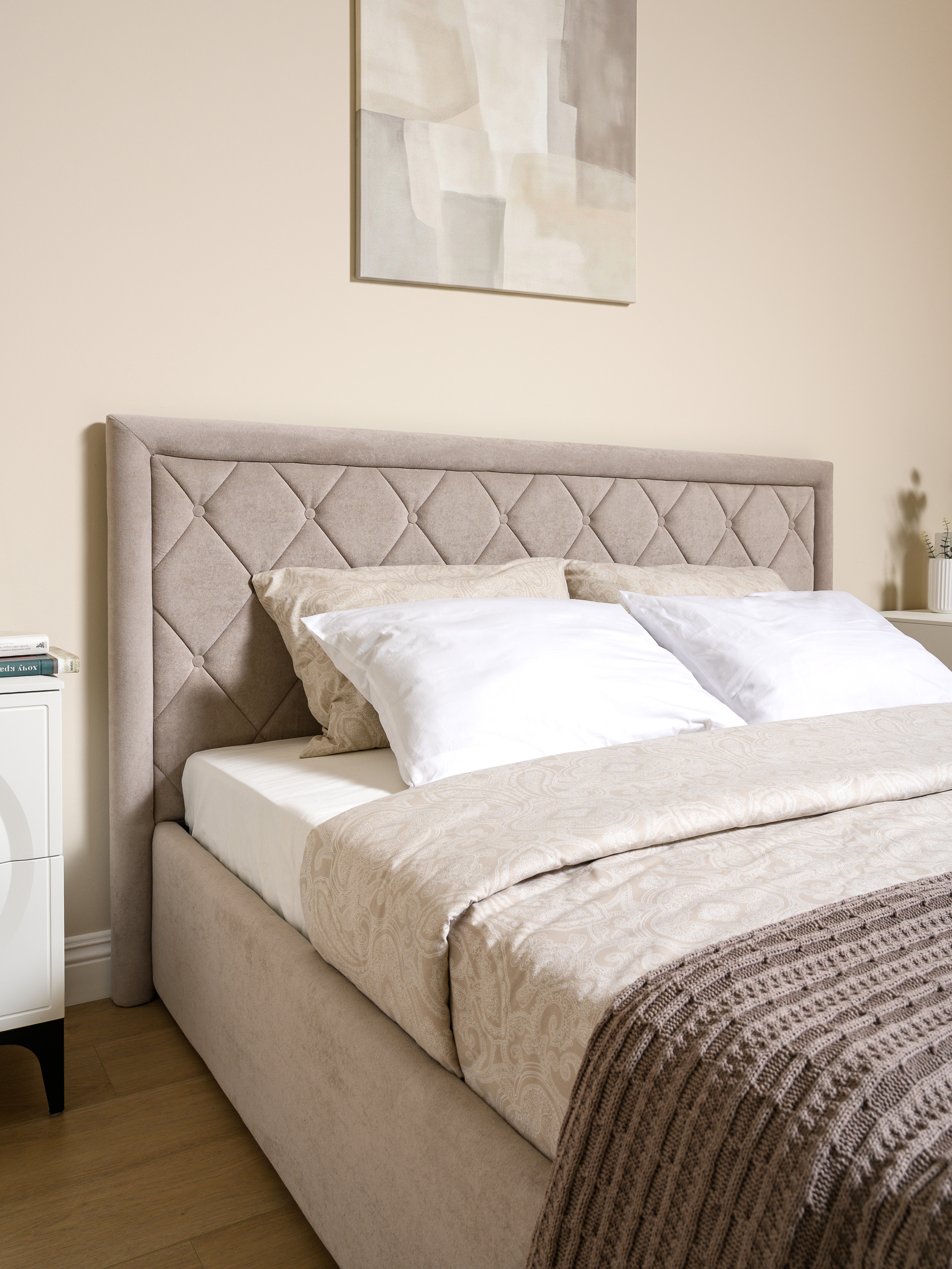 Кровать Марион — это идеальное сочетание стиля и комфорта. Элегантное изголовье оформлено стежкой в виде классической каретной стяжки, украшенной декоративными пуговицами, что придаёт изделию выразительный и утончённый вид. По всему периметру кровати проходит аккуратный валик, подчеркивающий геометрию и завершённость формы.