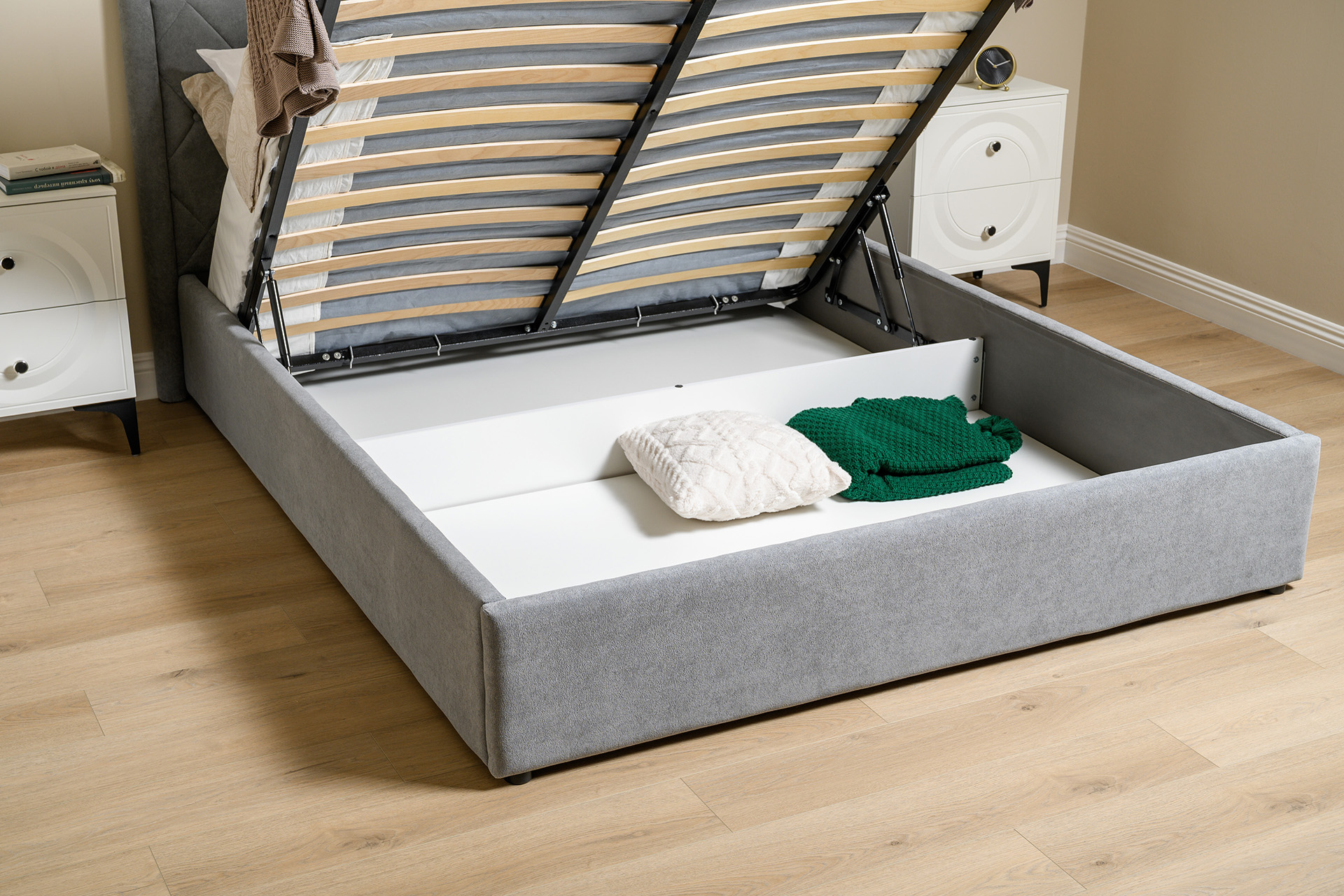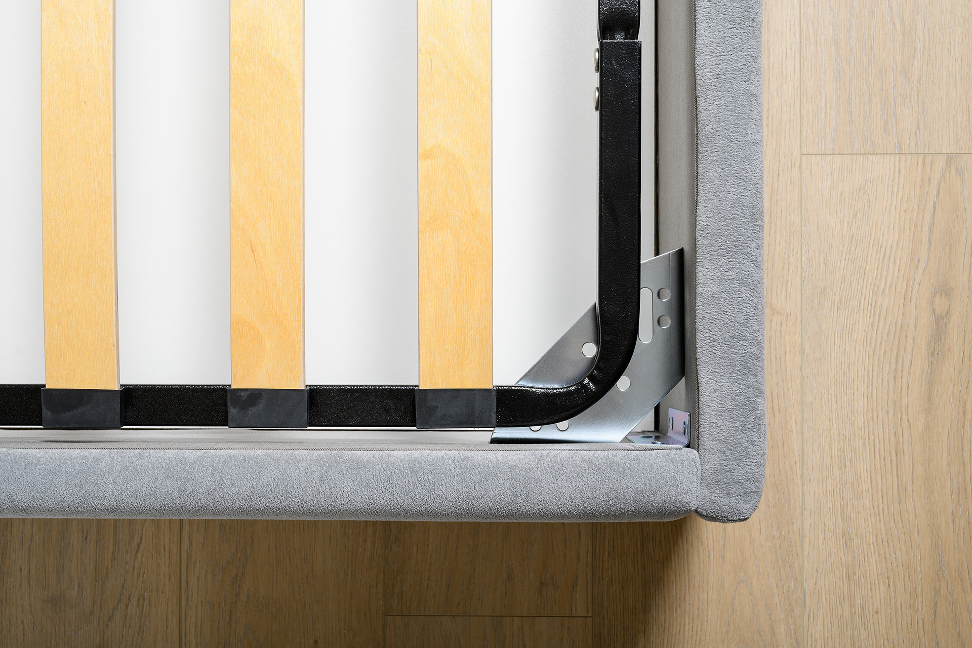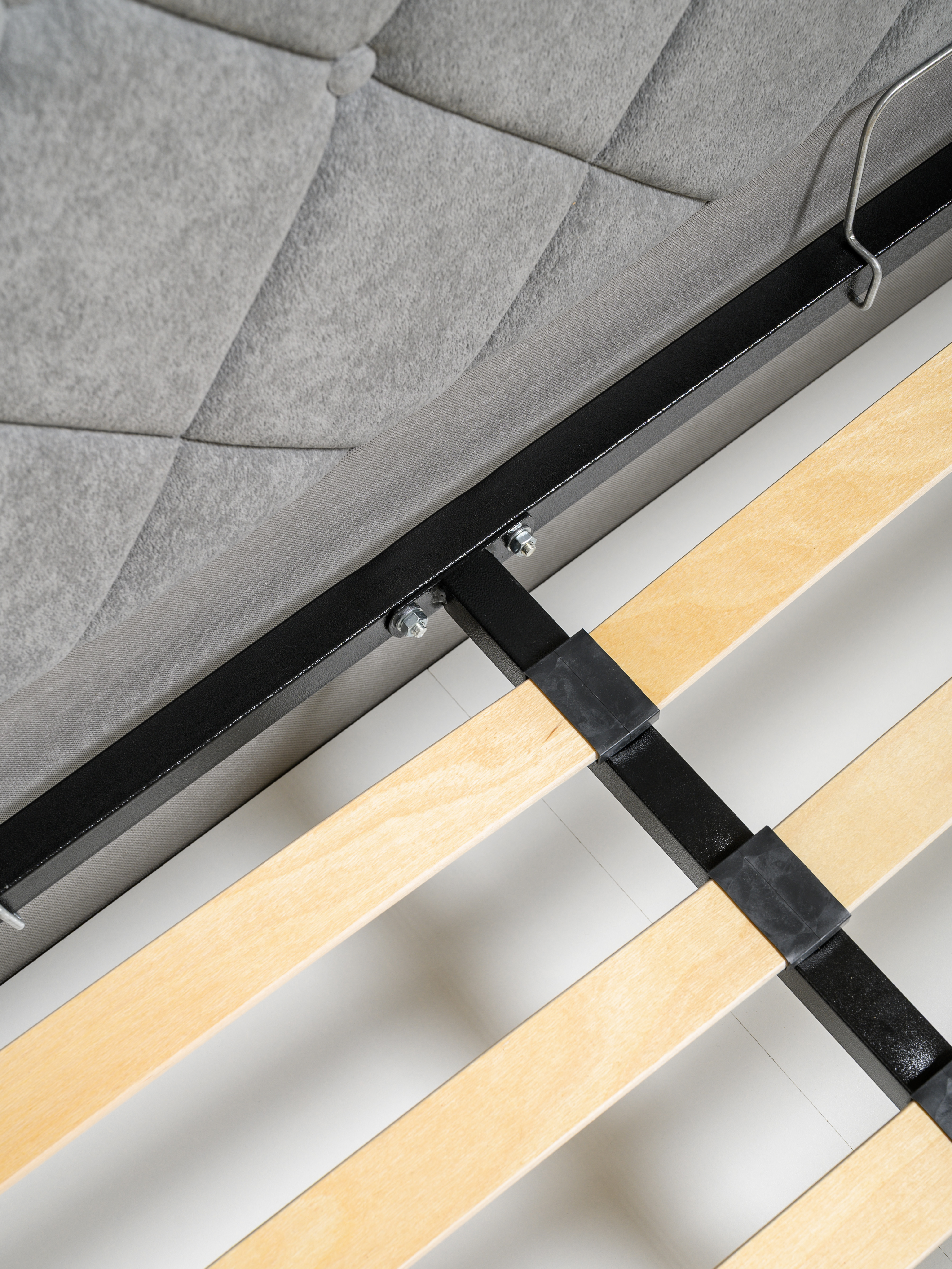 Основание кровати укомплектовано матрасодержателями. Жесткое кроватное дно из ЛДСП 16 мм на опорах 25 мм.