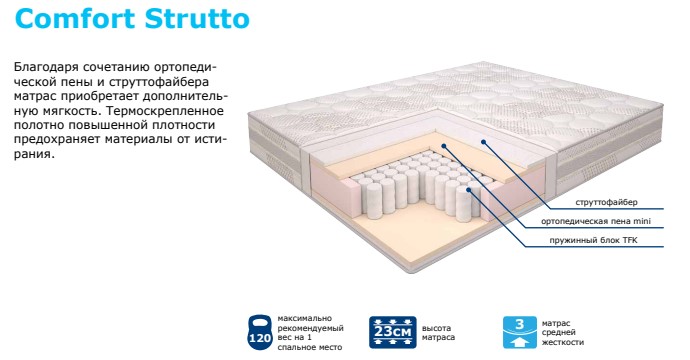 Благодаря гармоничному сочетанию ортопедической пены и струттофайбера матрас приобретает дополнительную мягкость. Чем толще и мягче верхний слой наполнителей, тем комфортнее Ваш отдых.