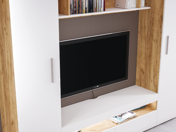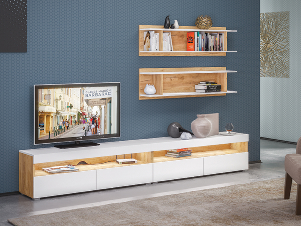 Тумба под ТВ в гостиную Альба дуб золотой CRAFT, белый премиум, без подсветки