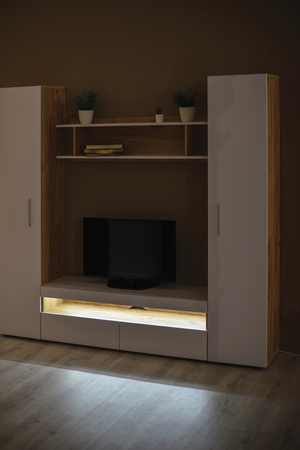 Тумбы под ТВ может быть укомплектована подсветкой, которая эффектно смотрится в интерьере и подчёркивает широкую нишу, свободную от перегородок.
