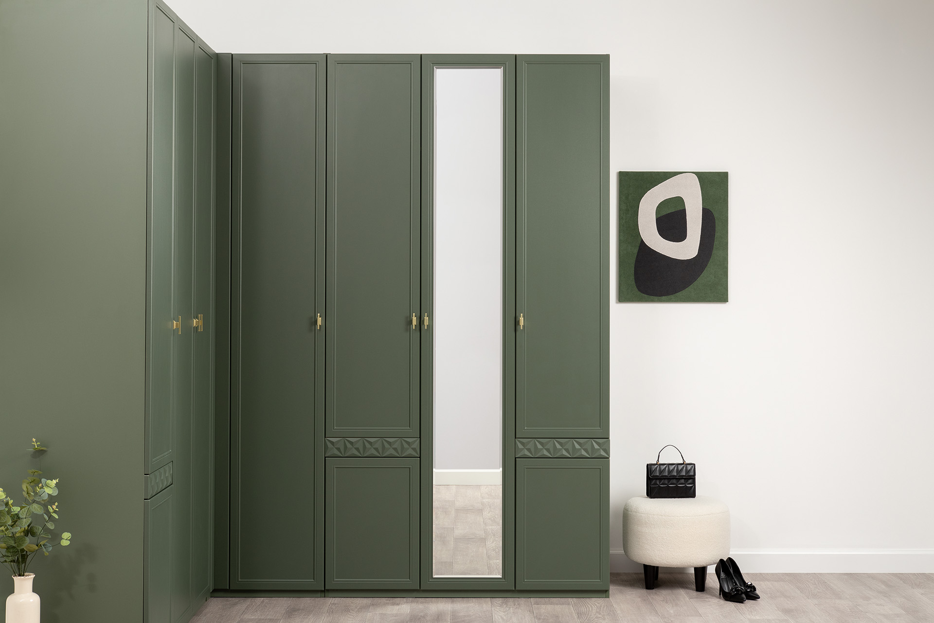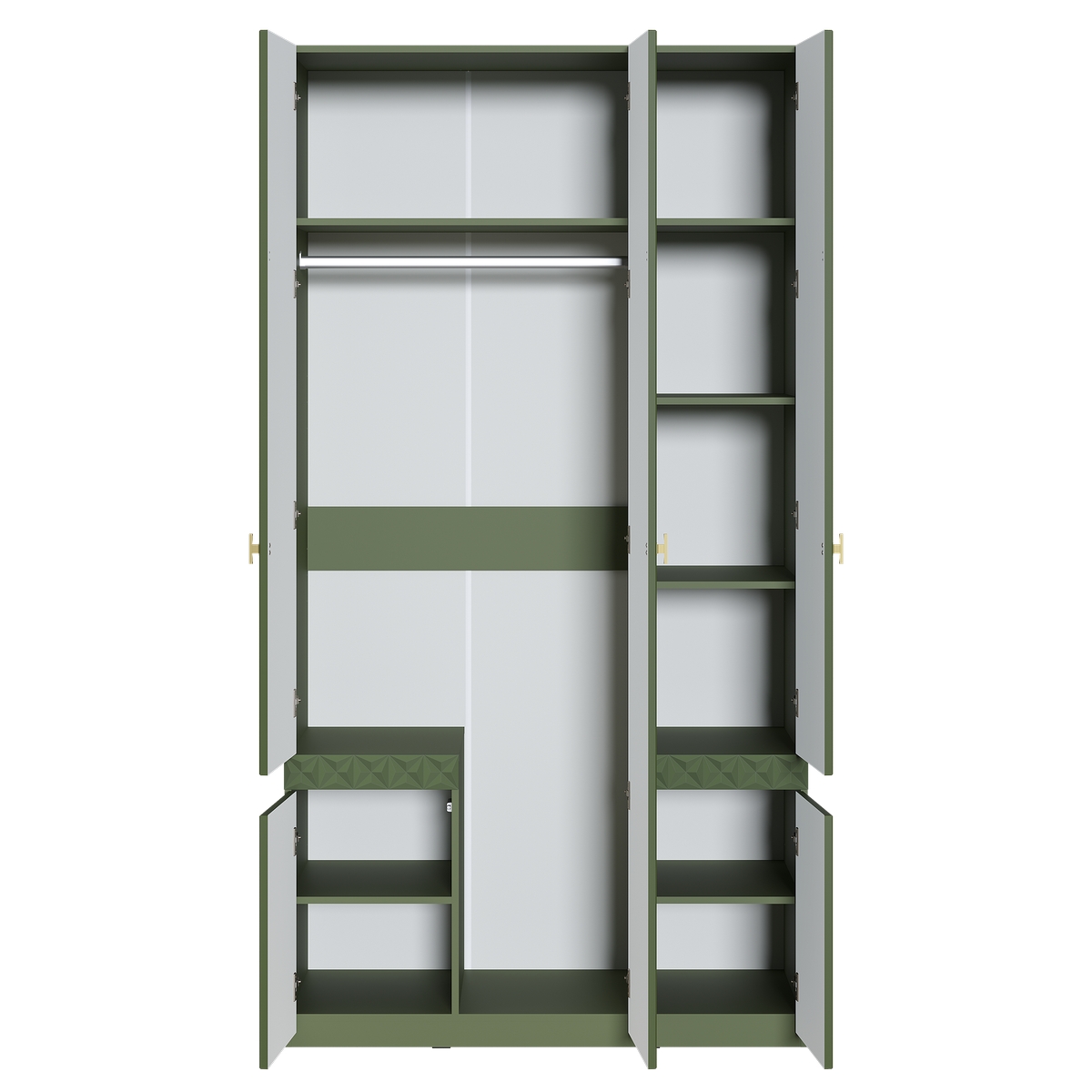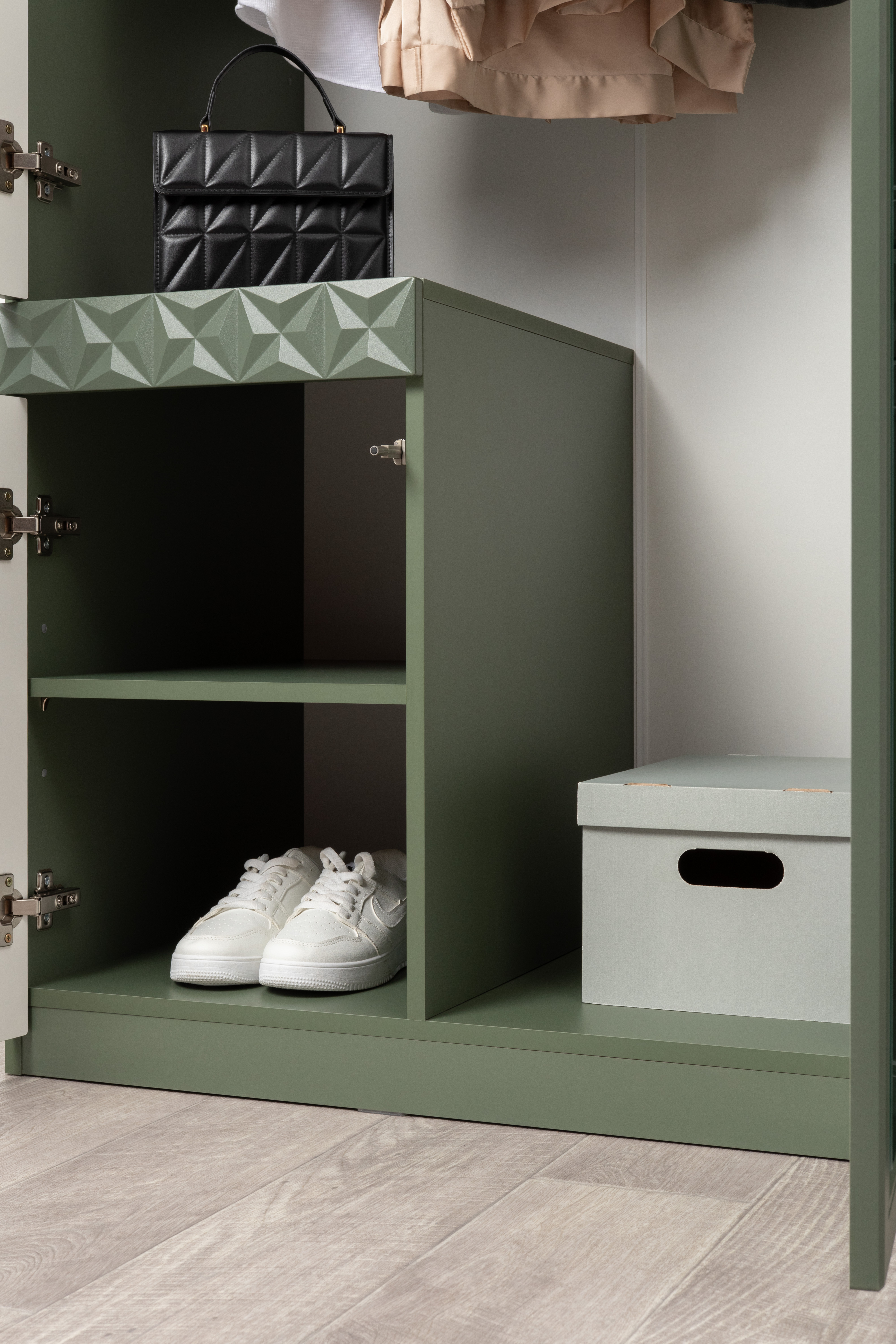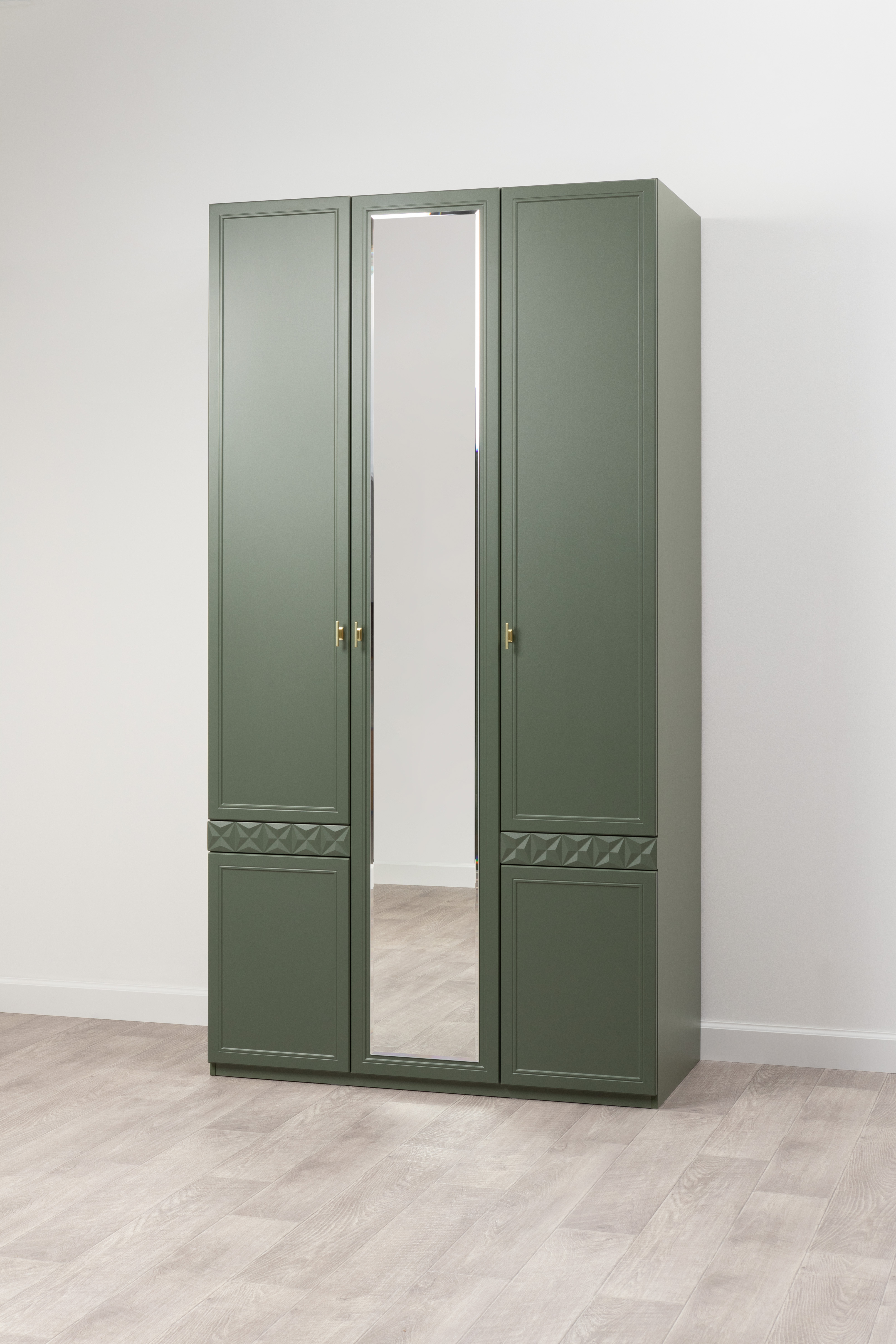 Шкаф для одежды Марион 16.340.03 дымчатый зеленый K521, олива шагрень AG 1050 ПВХ (собирается на любую сторону)