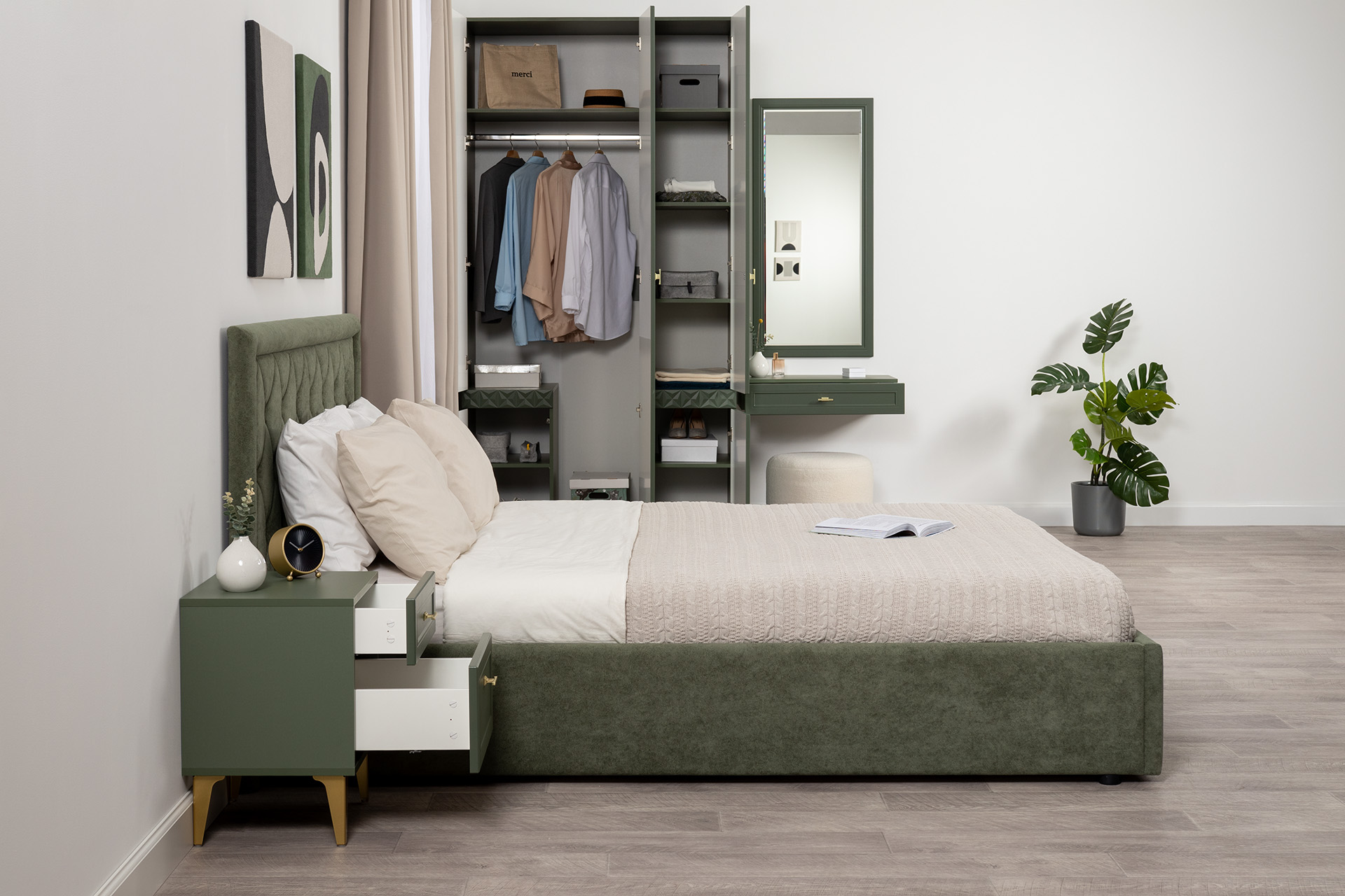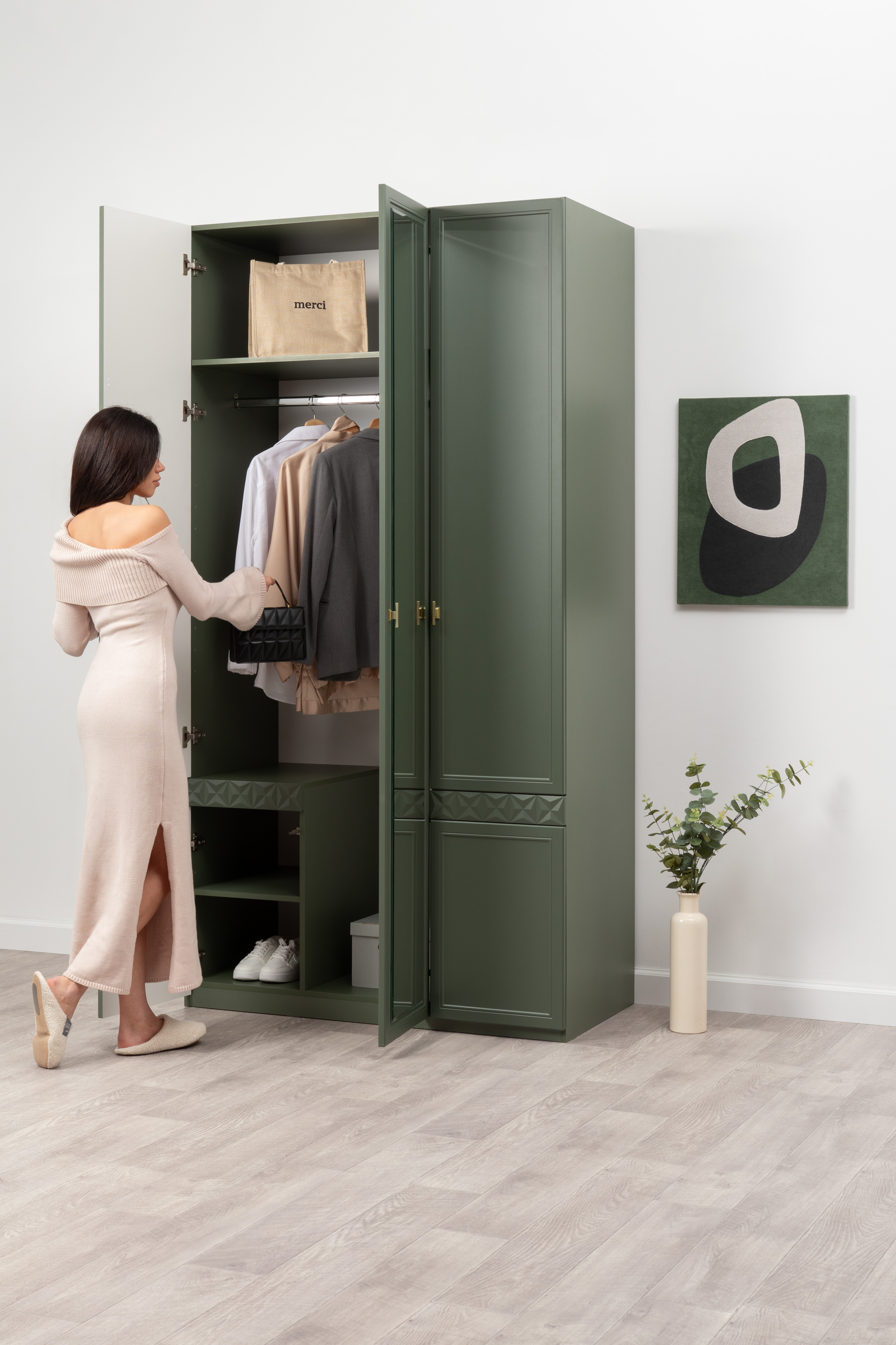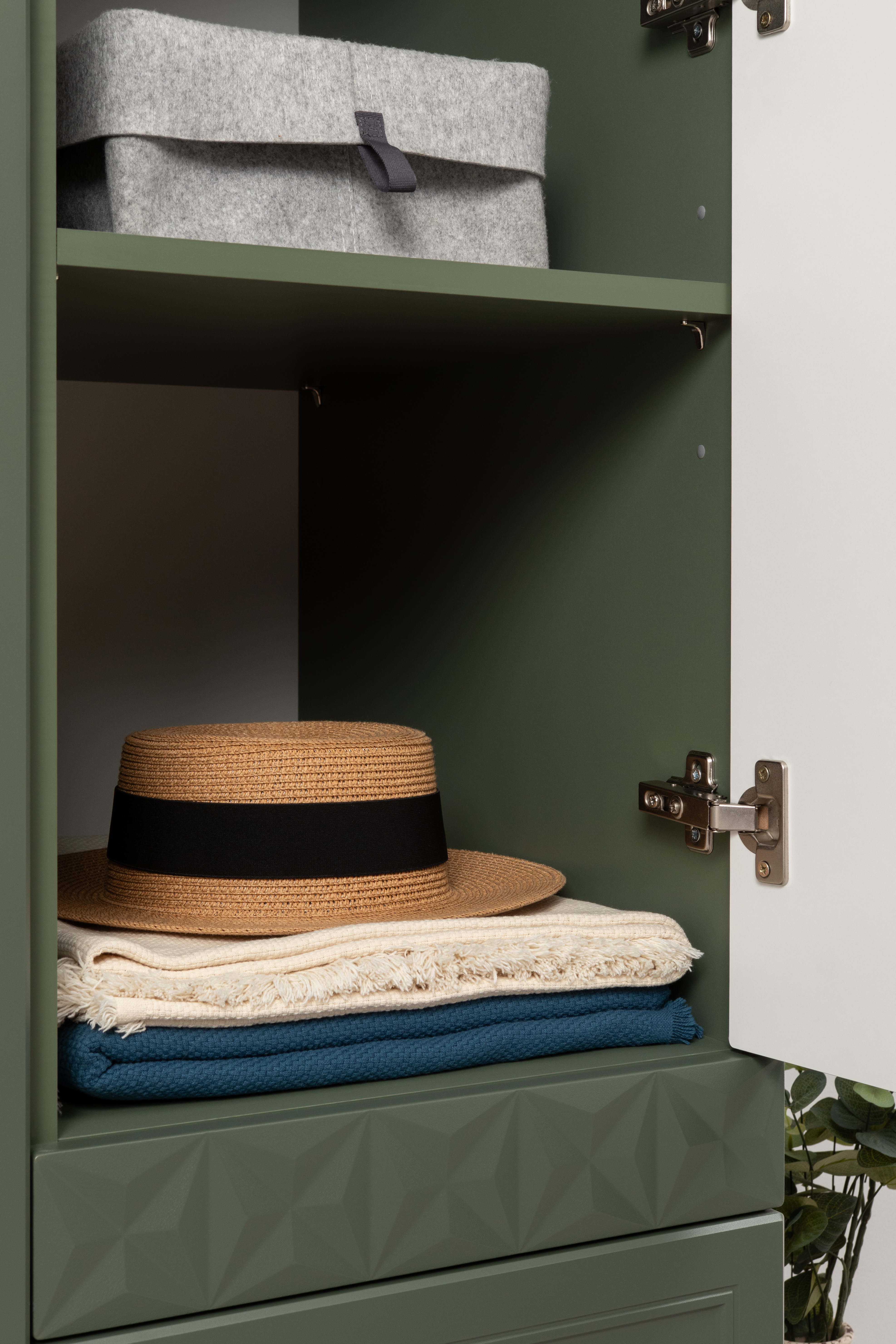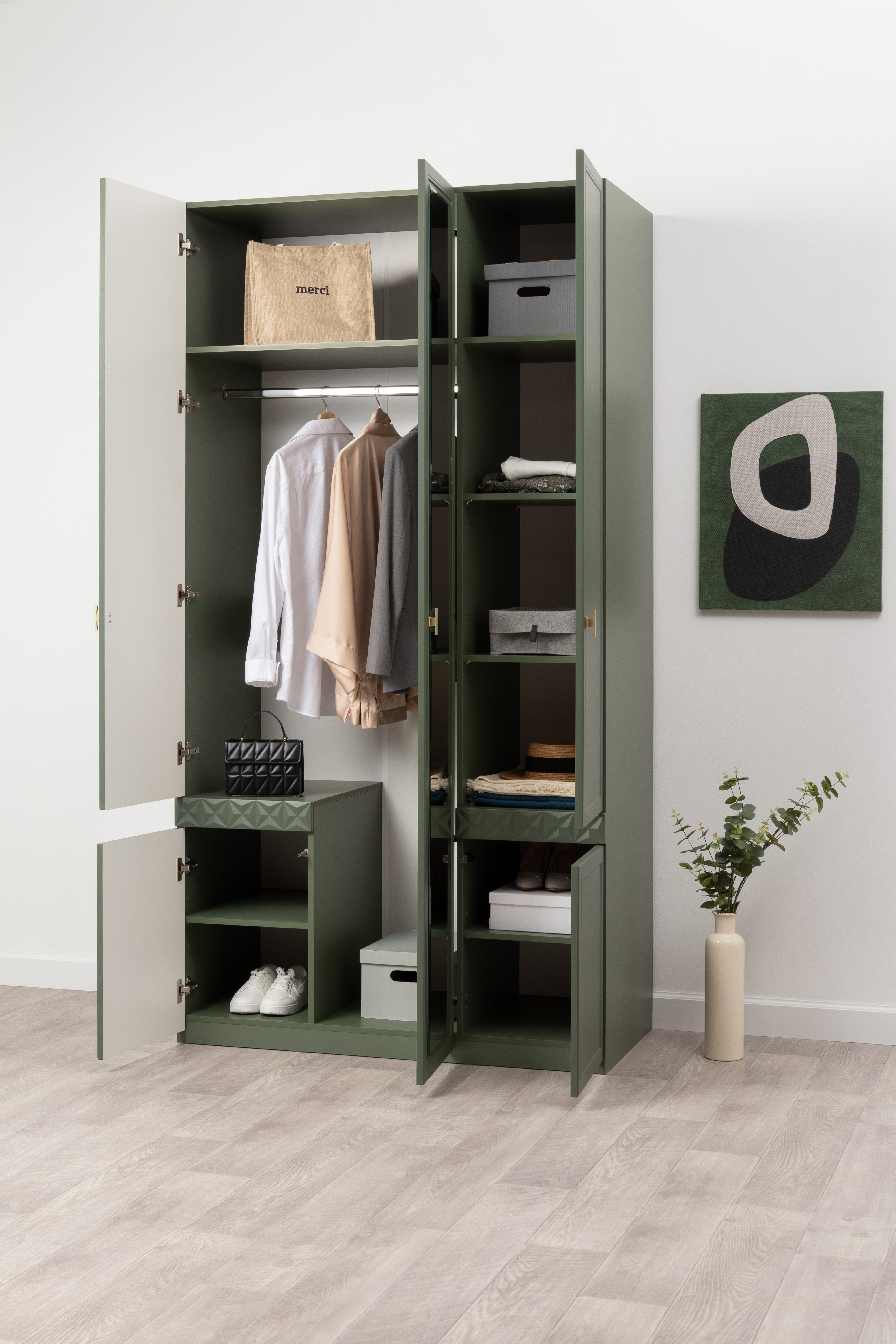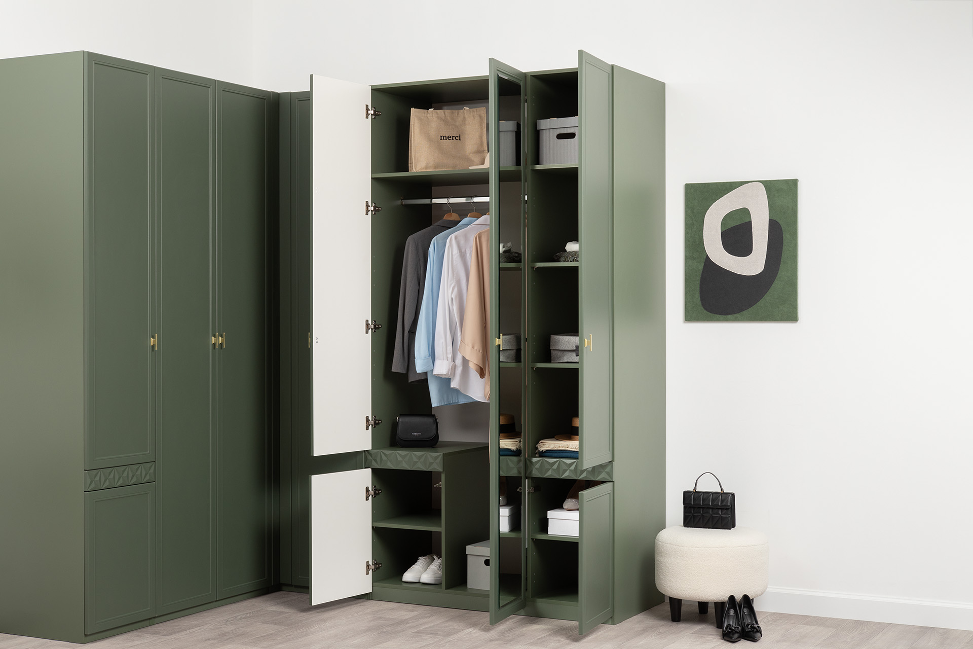 Шкаф для одежды Марион 16.340.03 дымчатый зеленый K521, олива шагрень AG 1050 ПВХ (собирается на любую сторону)