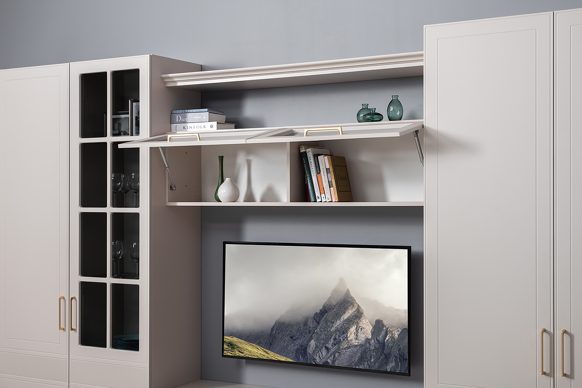 Петли с доводчиками, полное выдвижение ящиков, выдвижная штанга в шкафу для одежды и съемные полки делают использование максимально комфортным.