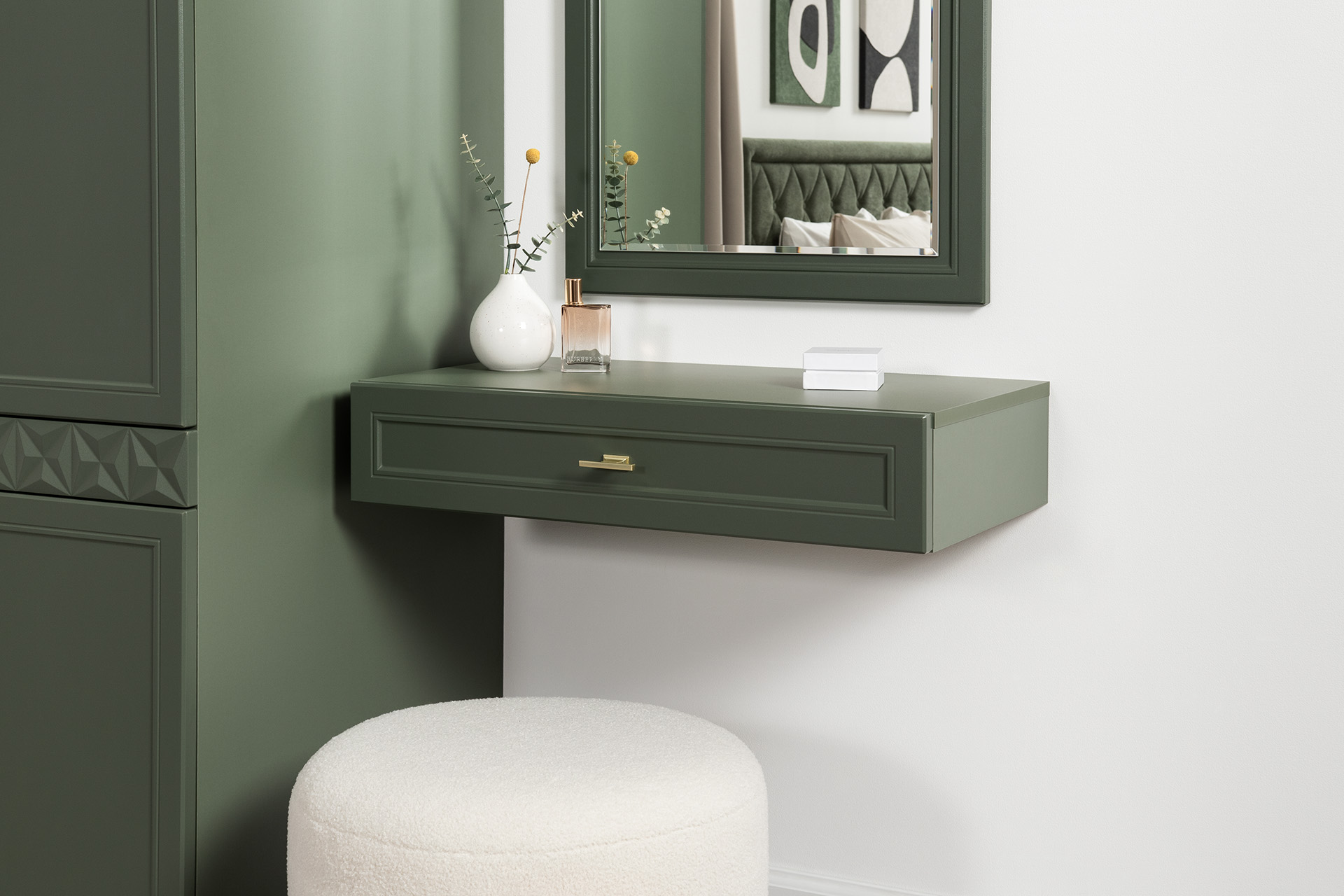 Комод Марион 16.256 дымчатый зеленый K521, олива шагрень AG 1050 ПВХ, белый PE шагрень