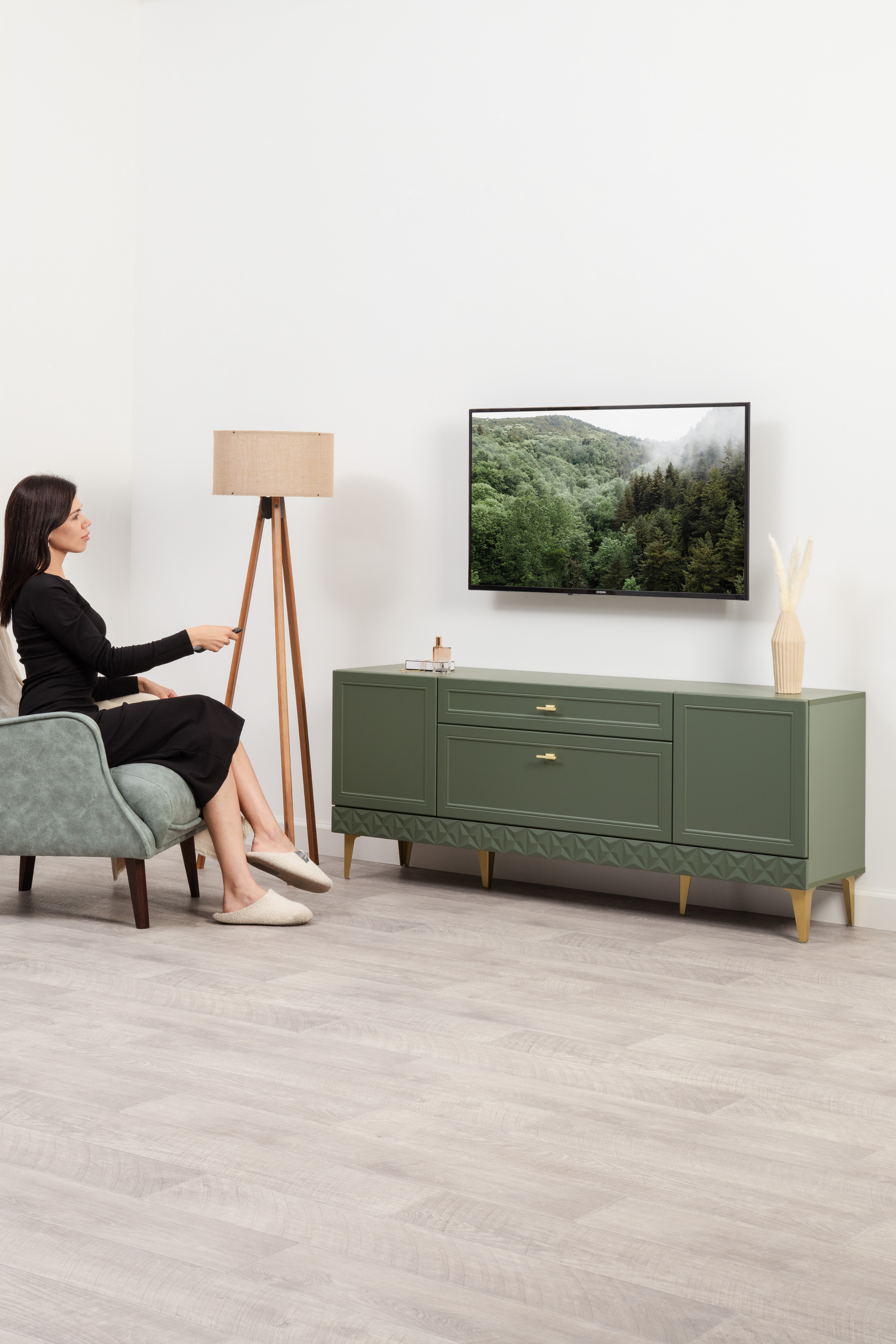 Изящные линии, глубокая фрезеровка фасадов из МДФ и благородные оттенки. Утончённая «Слоновая кость» и изысканная «Олива Шагрень» с глубоким зелёным тоном — создают атмосферу уюта, тепла и благородства. Металлические ручки и опоры золотого цвета придают мебели утончённый блеск, а петли и направляющие с доводчиками обеспечивают плавное и бесшумное закрытие фасадов.