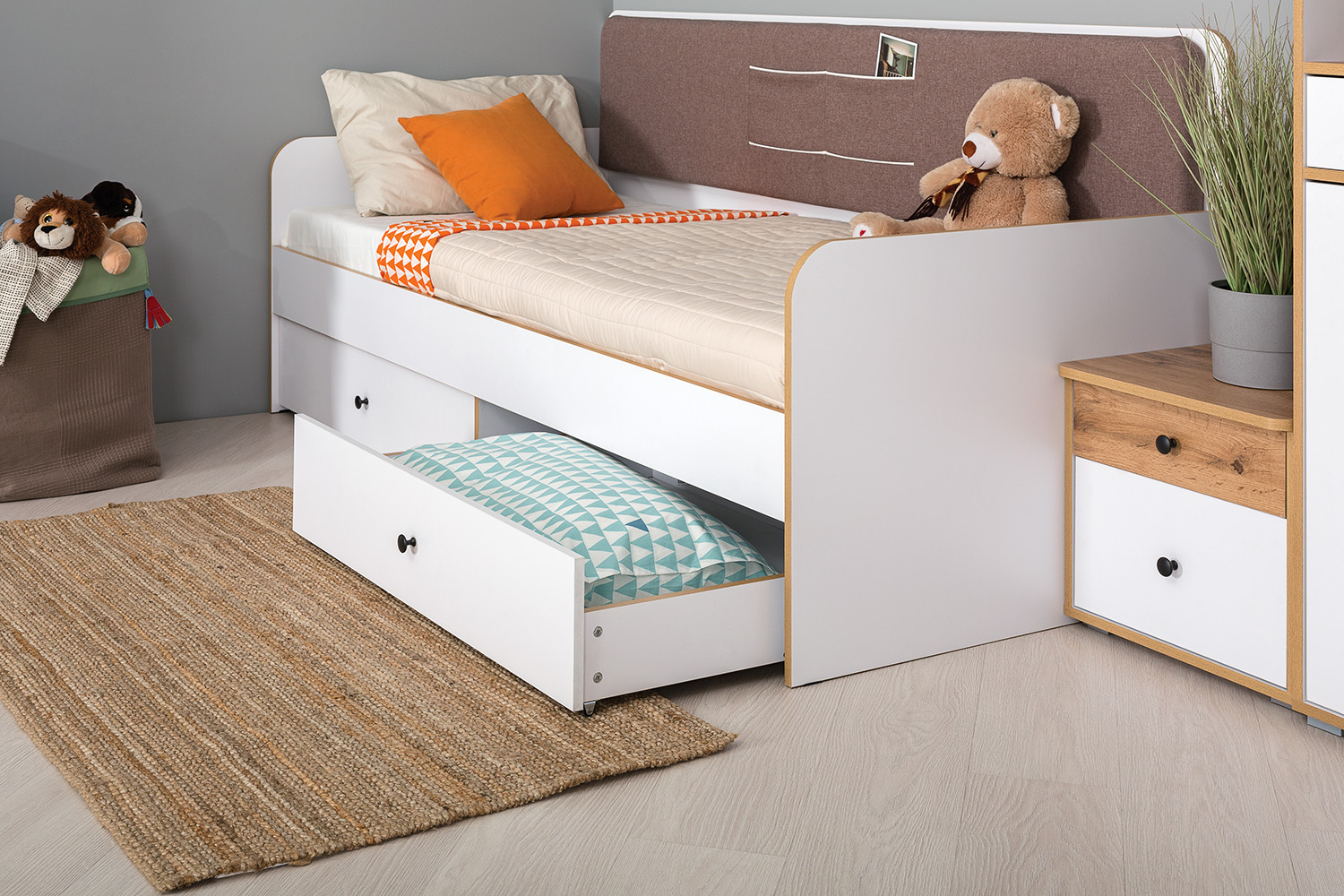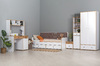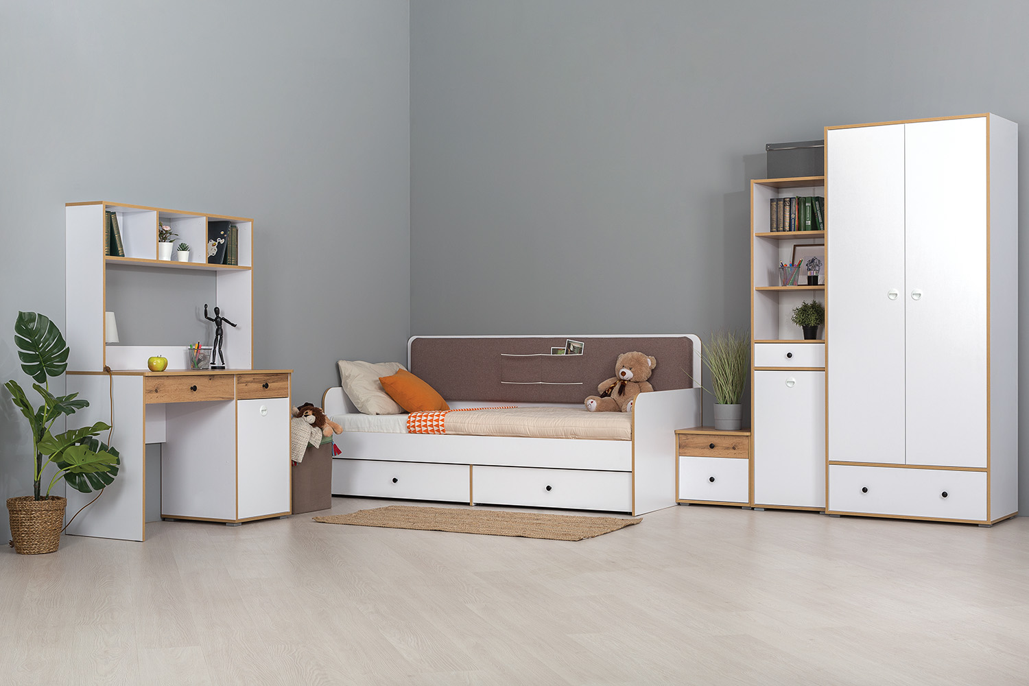 Светлая и аккуратная молодёжная мебель. Основой модульной системы является кровать-трансформер. Её столешница имеет постоянный горизонт, то есть при трансформации не нужно убирать вещи. Система хранения с подъёмными фасадами значительно расширяет функционал.